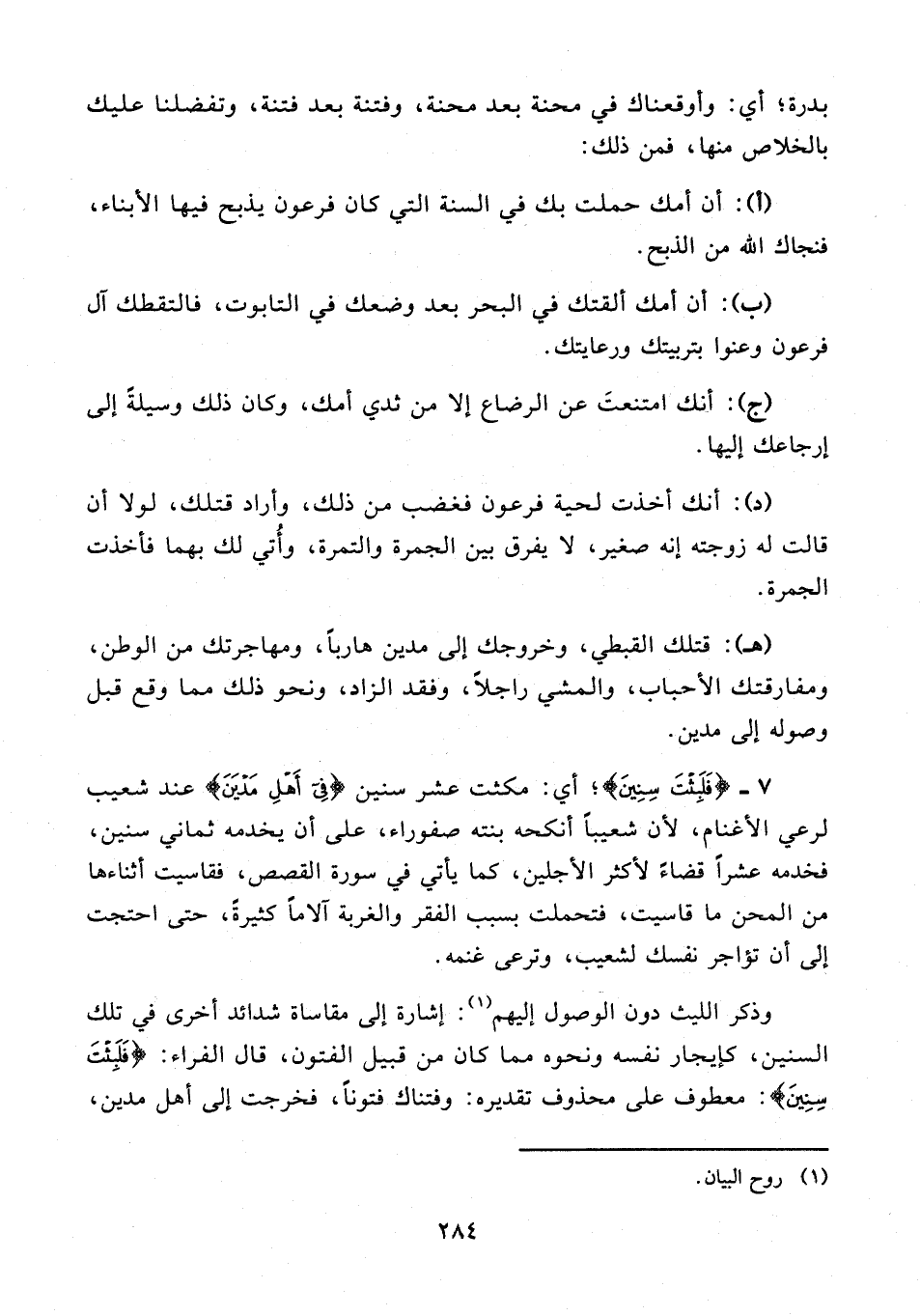 وذكر الليث دون الوصول إليهم (¬1): إشارة إلى مقاساة شدائد أخرى في تلك السنين، كإيجار نفسه ونحوه مما كان من قبيل الفتون، قال الفراء: {فَلَبِثْتَ سِنِينَ}: معطوف على محذوف تقديره: وفتناك فتونًا، فخرجت إلى أهل مدين،