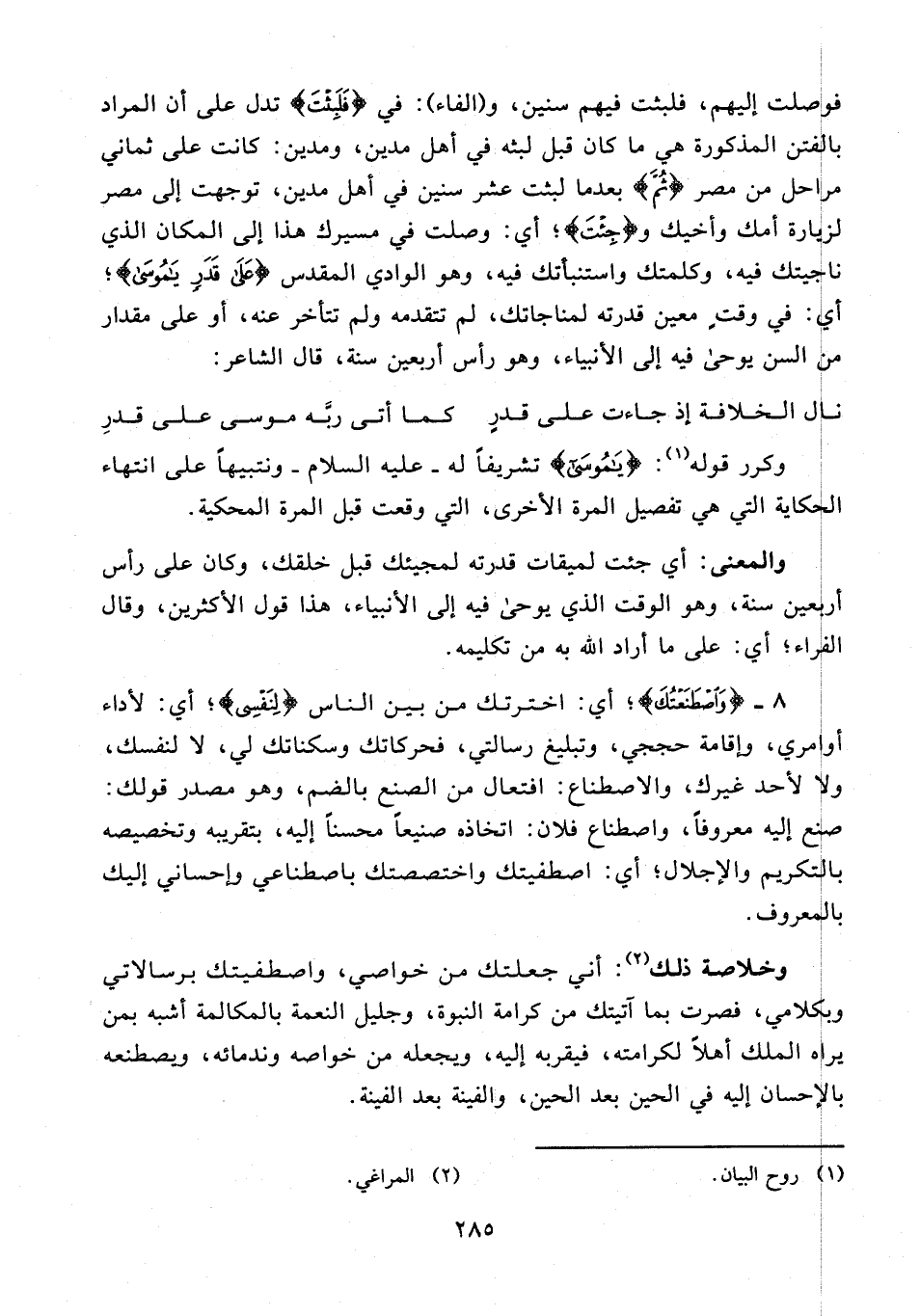 فوصلت إليهم، فلبثت فيهم سنين، و (الفاء): في {فَلَبِثْتَ} تدل على أن المراد بالفتن المذكورة هى ما كان قبل لبثه في أهل مدين، ومدين: كانت على ثماني مراحل من مصر {ثُمَّ} بعدما لبثت عشر سنين في أهل مدين، توجهت إلى مصر لزيارة أمك وأخيك و {جِئْتَ}؛ أي: وصلت في مسيرك هذا إلى المكان الذي ناجيتك فيه، وكلمتك واستنبأتك فيه، وهو الوادي المقدس {عَلَى قَدَرٍ يَا مُوسَى}؛ أي: في وقتٍ معين قدرته لمناجاتك، لم تتقدمه ولم تتأخر عنه، أو على مقدار من السن يوحى فيه إلى الأنبياء، وهو رأس أربعين سنة، قال الشاعر: