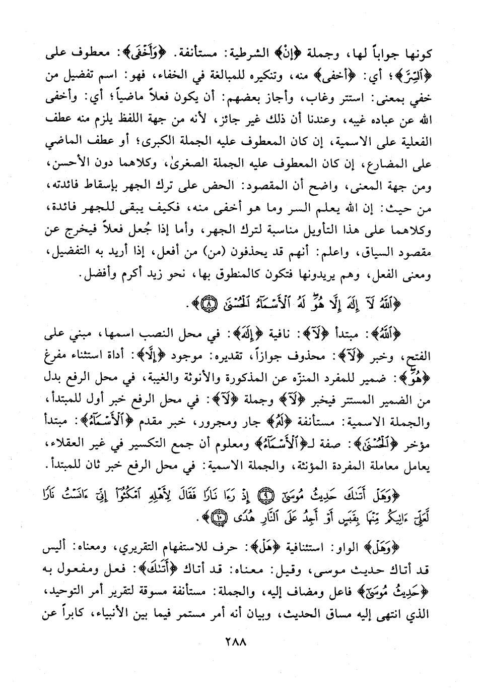 كونها جوابًا لها، وجملة {إنْ} الشرطية: مستأنفة. {وَأَخْفَى}: معطوف على {السِّرَّ}؛ أي: {أخفى} منه، وتنكيره للمبالغة في الخفاء، فهو: اسم تفضيل من خفي بمعنى: استتر وغاب، وأجاز بعضهم: أن يكون فعلًا ماضيًا؛ أي: وأخفى الله عن عباده غيبه، وعندنا أن ذلك غير جائز؛ لأنه من جهة اللفظ يلزم منه عطف الفعلية على الاسمية، إن كان المعطوف عليه الجملة الكبرى, أو عطف الماضي على المضارع، إن كان المعطوف عليه الجملة الصغرى، وكلاهما دون الأحسن، ومن جهة المعنى، واضح أن المقصود: الحض على ترك الجهر بإسقاط فائدته، من حيث: إن الله يعلم السر وما هو أخفى منه، فكيف يبقى للجهر فائدة، وكلاهما على هذا التأويل مناسبة لترك الجهر، وأما إذا جُعل فعلًا فيخرج عن مقصود السياق، واعلم: أنهم قد يحذفون (من) من أفعل، إذا أريد به التفضيل، ومعنى الفعل، وهم يريدونها فتكون كالمنطوق بها، نحو زيد أكرم وأفضل.