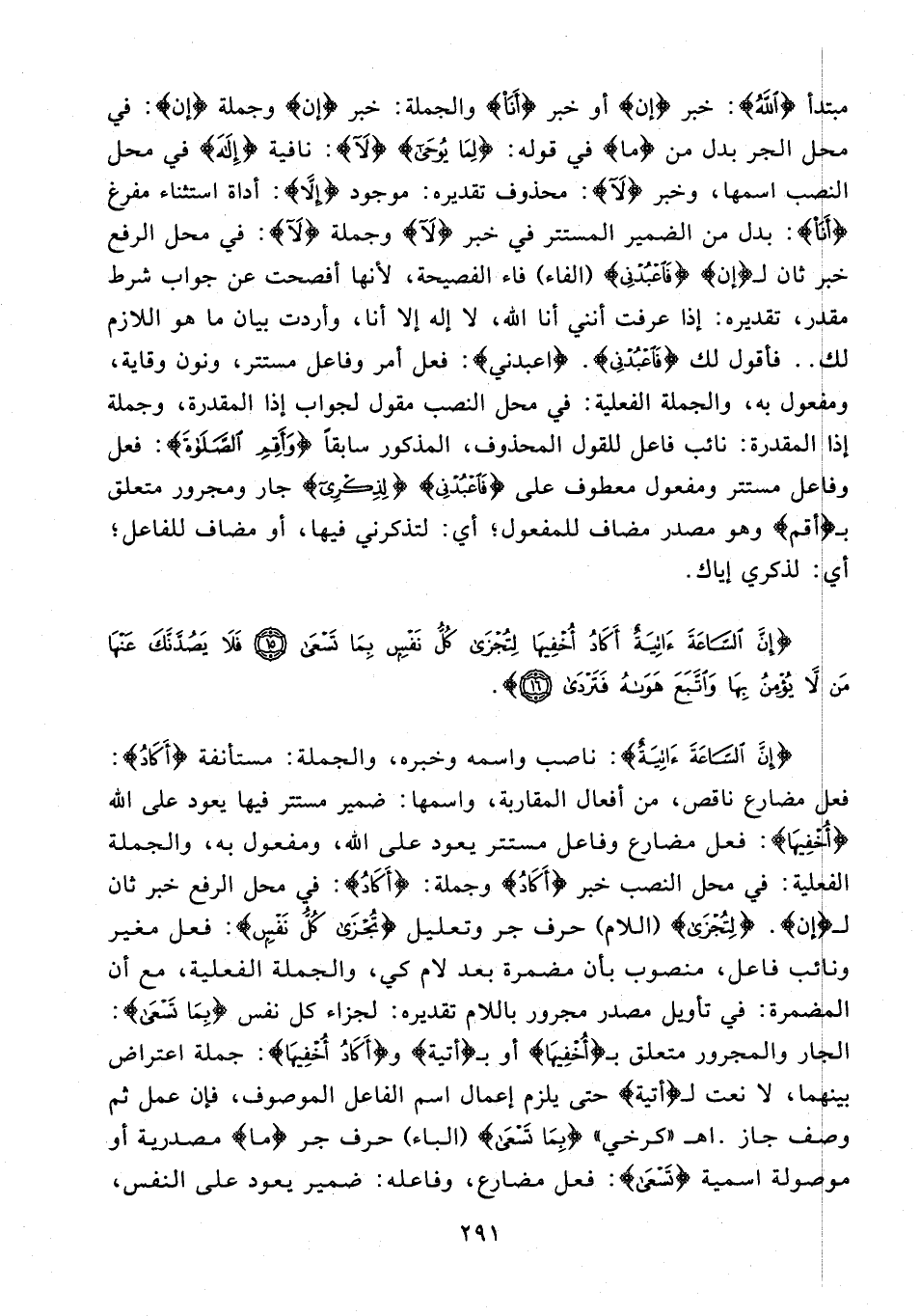 {إِنَّ السَّاعَةَ آتِيَةٌ}: ناصب واسمه وخبره، والجملة: مستأنفة {أَكَادُ}: فعل مضارع ناقص، من أفعال المقاربة، واسمها: ضمير مستتر فيها يعود على الله {أُخْفِيهَا}: فعل مضارع وفاعل مستتر يعود على الله، ومفعول به، والجملة الفعلية: في محل النصب خبر {أَكَادُ} وجملة: {أَكَادُ}: في محل الرفع خبر ثان لـ {إن}. {لِتُجْزَى} (اللام) حرف جر وتعليل {تُجْزَى كُلُّ نَفْسٍ}: فعل مغير ونائب فاعل، منصوب بأن مضمرة بعد لام كي، والجملة الفعلية، مع أن المضمرة: في تأويل مصدر مجرور باللام تقديره: لجزاء كل نفس {بِمَا تَسْعَى}: الجار والمجرور متعلق بـ {أُخْفِيهَا} أو بـ {أتية} و {أَكَادُ أُخْفِيهَا}: جملة اعتراض بينهما، لا نعت لـ {أتية} حتى يلزم إعمال اسم الفاعل الموصوف، فإن عمل ثم وصف جاز. اهـ "كرخي" {بِمَا تَسْعَى} (الباء) حرف جر {ما} مصدرية أو موصولة اسمية {تَسْعَى}: فعل مضارع، وفاعله: ضمير يعود على النفس،