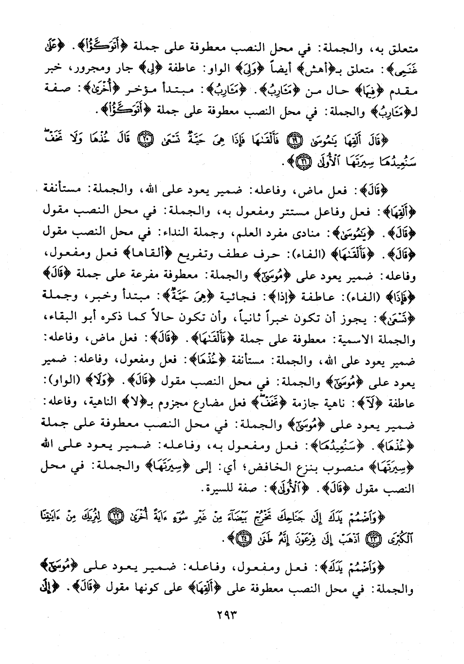 متعلق به، والجملة: في محل النصب معطوفة على جملة {أَتَوَكَّأُ}. {عَلَى غَنَمِي}: متعلق بـ {أهش} أيضًا {وَلِيَ} الواو: عاطفة {لِيَ} جار ومجرور، خبر مقدم {فِيهَا} حال من {مَآرِبُ}. {مَآرِبُ}: مبتدأ مؤخر {أُخْرَى}: صفة لـ {مَآرِبُ} والجملة: في محل النصب معطوفة على جملة {أَتَوَكَّأُ}.