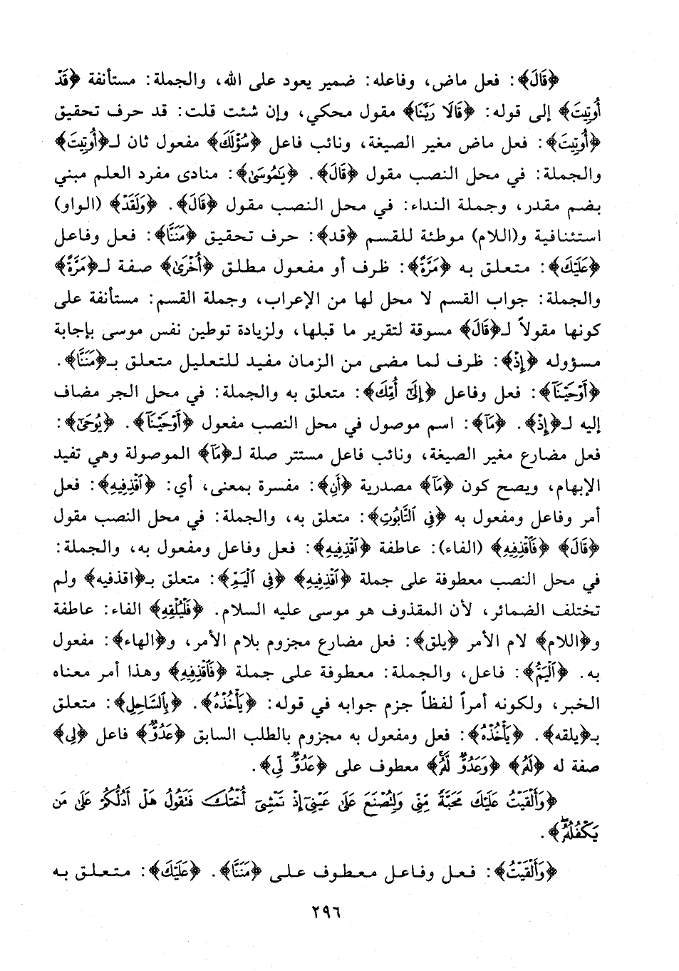 {قَالَ}: فعل ماض، وفاعله: ضمير يعود على الله، والجملة: مستأنفة {قَدْ أُوتِيتَ} إلى قوله: {قَالَا رَبَّنَا} مقول محكي، وإن شئت قلت: قد حرف تحقيق {أُوتِيتَ}: فعل ماض مغير الصيغة، ونائب فاعل {سُؤْلَكَ} مفعول ثان لـ {أُوتِيتَ} والجملة: في محل النصب مقول {قَالَ}. {يَا مُوسَى}: منادى مفرد العلم مبني بضم مقدر، وجملة النداء: في محل النصب مقول {قَالَ}. {وَلَقَدْ} (الواو) استئنافية و (اللام) موطئة للقسم {قد}: حرف تحقيق {مَنَنَّا}: فعل وفاعل {عَلَيْكَ}: متعلق به {مَرَّةً}: ظرف أو مفعول مطلق {أُخْرَى} صفة لـ {مَرَّةً} والجملة: جواب القسم لا محل لها من الإعراب، وجملة القسم: مستأنفة على كونها مقولًا لـ {قَالَ} مسوقة لتقرير ما قبلها, ولزيادة توطين نفس موسى بإجابة مسؤوله {إِذْ}: ظرف لما مضى من الزمان مفيد للتعليل متعلق بـ {مَنَنَّا}. {أَوْحَيْنَا}: فعل وفاعل {إِلَى أُمِّكَ}: متعلق به والجملة: في محل الجر مضاف إليه لـ {إِذْ}. {مَآ}: اسم موصول في محل النصب مفعول {أَوْحَيْنَا}. {يُوحَى}: فعل مضارع مغير الصيغة، ونائب فاعل مستتر صلة لـ {مَا} الموصولة وهي تفيد الإبهام، ويصح كون {مَا} مصدرية {أَنِ}: مفسرة بمعنى، أي: {اقْذِفِيهِ}: فعل أمر وفاعل ومفعول به {فِي التَّابُوتِ}: متعلق به، والجملة: في محل النصب مقول {قَالَ} {فَاقْذِفِيهِ} (الفاء): عاطفة {اقْذِفِيهِ}: فعل وفاعل ومفعول به، والجملة: في محل النصب معطوفة على جملة {اقْذِفِيهِ} {فِي الْيَمِّ}: متعلق بـ {اقذفيه} ولم تختلف الضمائر؛ لأن المقذوف هو موسى عليه السلام. {فَلْيُلْقِهِ} الفاء: عاطفة و {اللام} لام الأمر {يلق}: فعل مضارع مجزوم بلام الأمر، و {الهاء}: مفعول به. {الْيَمُّ}: فاعل، والجملة: معطوفة على جملة {فَاقْذِفِيهِ} وهذا أمر معناه الخبر، ولكونه أمرًا لفظًا جزم جوابه في قوله: {يَأْخُذْهُ}. {بِالسَّاحِلِ}: متعلق بـ {يلقه}. {يَأْخُذْهُ}: فعل ومفعول به مجزوم بالطلب السابق {عَدُوٌّ} فاعل {لِي} صفة له {لَهُ} {وَعَدُوٌّ لَهُ} معطوف على {عَدُوٌّ لِي}.