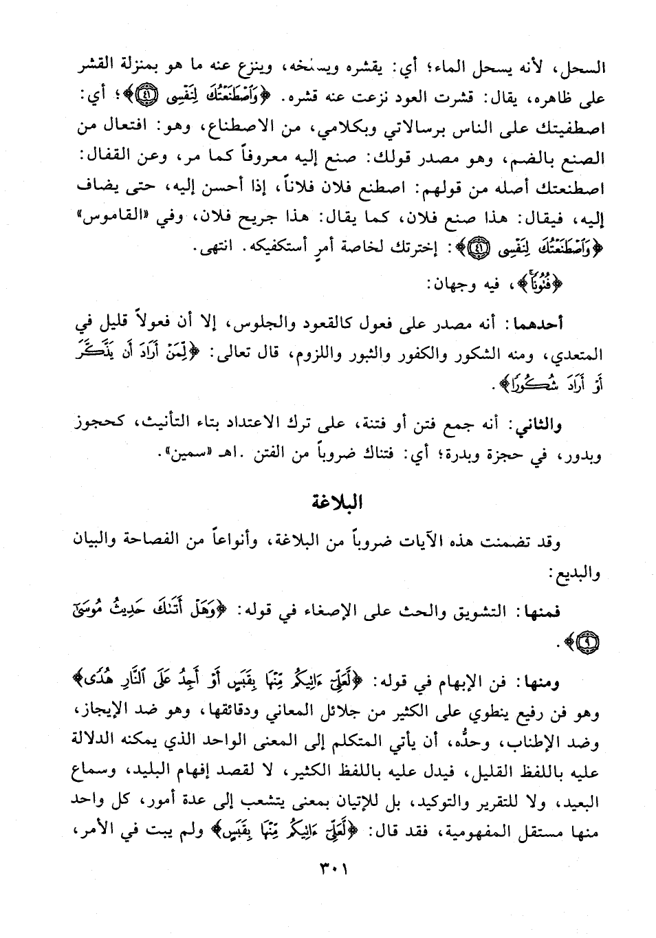 السحل؛ لأنه يسحل الماء؛ أي: يقشره ويسلخه، وينزع عنه ما هو بمنزلة القشر على ظاهره، يقال: قشرت العود نزعت عنه قشره. {وَاصْطَنَعْتُكَ لِنَفْسِي (41)}؛ أي: اصطفيتك على الناس برسالاتي وبكلامي، من الاصطناع، وهو: افتعال من الصنع بالضم، وهو مصدر قولك: صنع إليه معروفًا كما مر، وعن القفال: اصطنعتك أصله من قولهم: اصطنع فلان فلانًا، إذا أحسن إليه، حتى يضاف إليه، فيقال: هذا صنع فلان، كما يقال: هذا جريح فلان، وفي "القاموس" {وَاصْطَنَعْتُكَ لِنَفْسِي (41)}: إخترتك لخاصة أمرٍ أستكفيكه. انتهى.