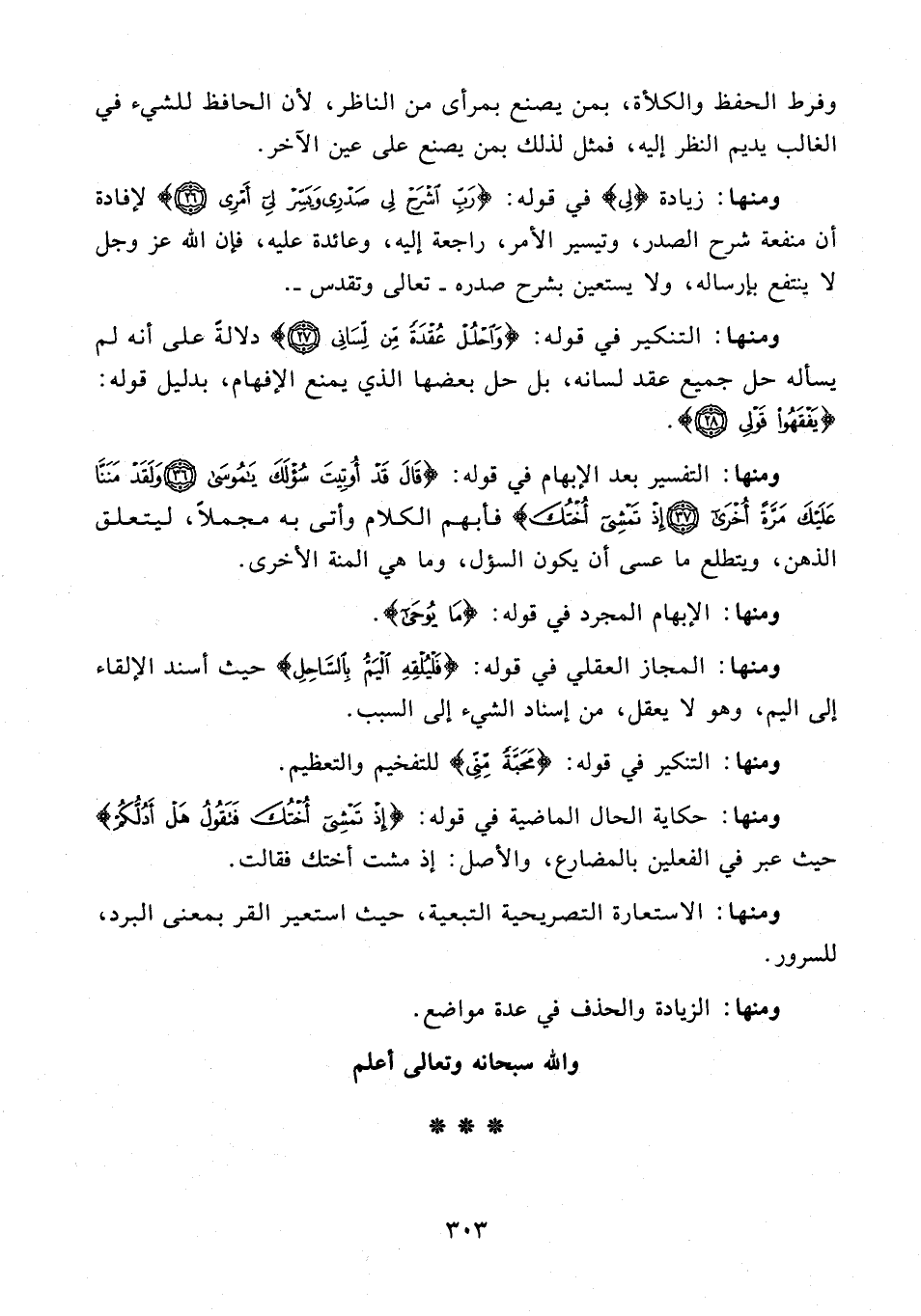 ومنها: التفسير بعد الإبهام في قوله: {قَالَ قَدْ أُوتِيتَ سُؤْلَكَ يَا مُوسَى (36) وَلَقَدْ مَنَنَّا عَلَيْكَ مَرَّةً أُخْرَى (37) إِذْ أَوْحَيْنَا إِلَى أُمِّكَ} فأبهم الكلام وأتى به مجملًا، ليتعلق الذهن، ويتطلع ما عسى أن يكون السؤل، وما هي المنة الأخرى.