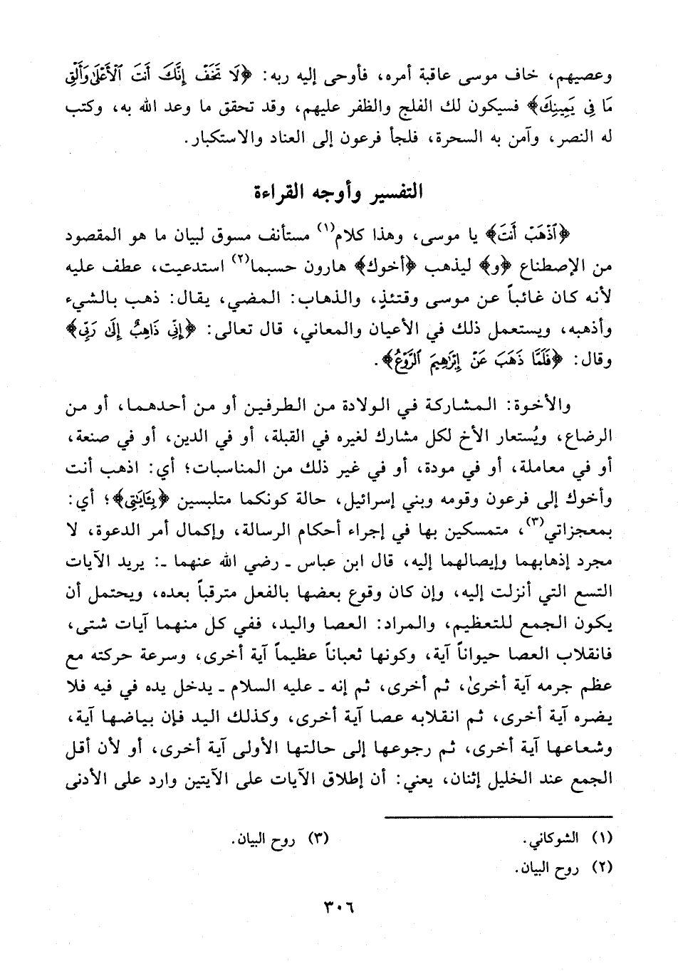 والأخوة: المشاركة في الولادة من الطرفين أو من أحدهما، أو من الرضاع، ويُستعار الأخ لكل مشارك لغيره في القبلة، أو في الدين، أو في صنعة، أو في معاملة، أو في مودة، أو في غير ذلك من المناسبات؛ أي: اذهب أنت وأخوك إلى فرعون وقومه وبني إسرائيل، حالة كونكما متلبسين {بِآيَاتِي}؛ أي: بمعجزاتي (¬3)، متمسكين بها في إجراء أحكام الرسالة، وإكمال أمر الدعوة، لا مجرد إذهابهما وإيصالهما إليه، قال ابن عباس - رضي الله عنهما -: يريد الآيات التسع التي أنزلت إليه، وإن كان وقوع بعضها بالفعل مترقبًا بعده، ويحتمل أن يكون الجمع للتعظيم، والمراد: العصا واليد، ففي كل منهما آيات شتى، فانقلاب العصا حيوانًا آية، وكونها ثعبانًا عظيمًا آية أخرى، وسرعة حركته مع عظم جرمه آية أخرى، ثم أخرى، ثم إنه - عليه السلام - يدخل يده في فيه فلا يضره آية أخرى، ثم انقلابه عصا آية أخرى، وكذلك اليد فإن بياضها آية، وشعاعها آية أخرى، ثم رجوعها إلى حالتها الأولى آية أخرى، أو لأن أقل الجمع عند الخليل إثنان، يعني: أن إطلاق الآيات على الآيتين وارد على الأدنى