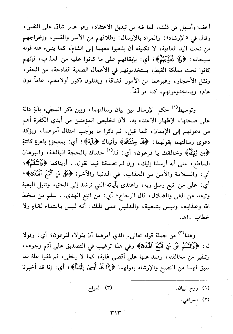 أخف وأسهل من ذلك، لما فيه من تبديل الاعتقاد، وهو عسر شاق على النفس، وقال في "الإرشاد": والمراد بالإرسال: إطلاقهم من الأسر والقسر، وإخراجهم من تحت اليد العادية، لا تكليفه أن يذهبوا معهما إلى الشام، كما ينبىء عنه قوله سبحانه: {وَلَا تُعَذِّبْهُمْ}؛ أي: بإبقائهم على ما كانوا عليه من العذاب، فإنهم كانوا تحت مملكة القبط، يستخدمونهم في الأعمال الصعبة القادحة، من الحفر، ونقل الأحجار، وغيرهما من الأمور الشاقة، ويقتلون ذكور أولادهم، عامًا دون عام، ويستخدومونهم، كما مر آنفًا.
