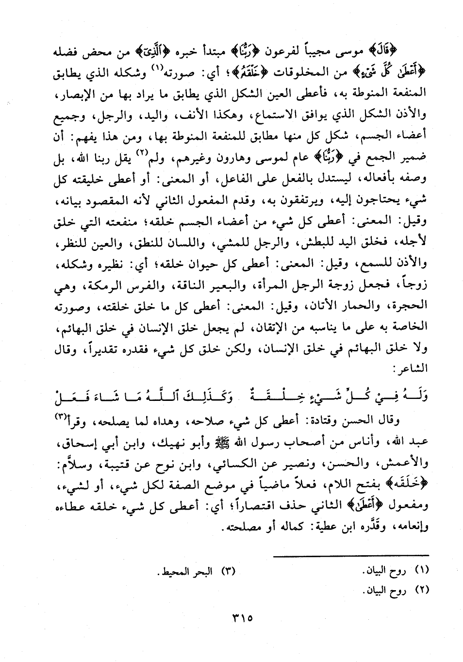 50 - {قَالَ} موسى مجيبًا لفرعون {رَبُّنَا} مبتدأ خبره {الَّذِي} من محض فضله {أَعْطَى كُلَّ شَيْءٍ} من المخلوقات {خَلْقَهُ}؛ أي: صورته (¬1) وشكله الذي يطابق المنفعة المنوطة به، فأعطى العين الشكل الذي يطابق ما يراد بها من الإبصار، والأذن الشكل الذي يوافق الاستماع، وهكذا الأنف، واليد، والرجل، وجميع أعضاء الجسم، شكل كل منها مطابق للمنفعة المنوطة بها، ومن هذا يفهم: أن ضمير الجمع في {رَبُّنَا} عام لموسى وهارون وغيرهم، ولم (¬2) يقل ربنا الله، بل وصفه بأفعاله، ليستدل بالفعل على الفاعل، أو المعنى: أو أعطى خليقته كل شيء يحتاجون إليه، ويرتفقون به، وقدم المفعول الثاني لأنه المقصود بيانه، وقيل: المعنى: أعطى كل شيء من أعضاء الجسم خلقه , منفعته التي خلق لأجله، فخلق اليد للبطش، والرجل للمشي، واللسان للنطق، والعين للنظر، والأذن للسمع، وقيل: المعنى: أعطى كل حيوان خلقه؛ أي: نظيره وشكله، زوجًا، فجعل زوجة الرجل المرأة، والبعير الناقة، والفرس الرمكة، وهي الحجرة، والحمار الأتان، وقيل: المعنى: أعطى كل ما خلق خلقته، وصورته الخاصة به على ما يناسبه من الإتقان، لم يجعل خلق الإنسان في خلق البهائم، ولا خلق البهائم في خلق الإنسان، ولكن خلق كل شيء فقدره تقديرًا، وقال الشاعر: