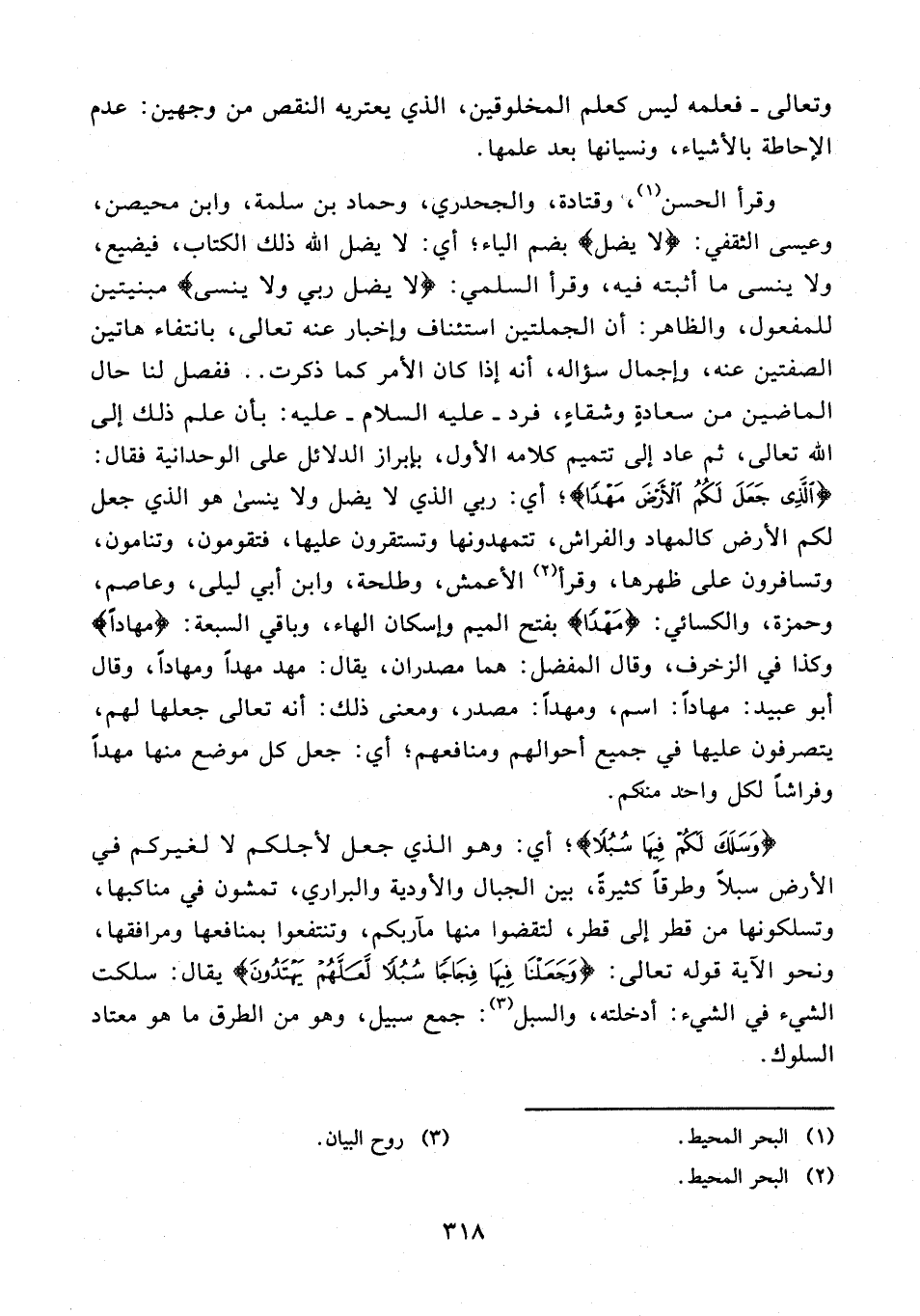 وقرأ الحسن (¬1)، وقتادة، والجحدري، وحماد بن سلمة، وابن محيصن، وعيسى الثقفي: {لا يضل} بضم الياء؛ أي: لا يضل الله ذلك الكتاب، فيضيع، ولا ينسى ما أثبته فيه، وقرأ السلمي: {لا يضل ربي ولا ينسى} مبنيتين للمفعول، والظاهر: أن الجملتين استئناف وإخبار عنه تعالى، بانتفاء هاتين الصفتين عنه، وإجمال سؤاله، أنه إذا كان الأمر كما ذكرت .. ففصل لنا حال الماضين من سعادةٍ وشقاءٍ, فرد - عليه السلام - عليه: بأن علم ذلك إلى الله تعالى،