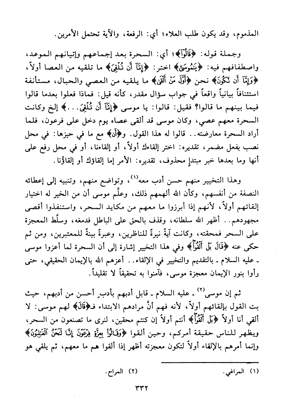 66 - ثم إن موسى (¬2) - عليه السلام - قابل أدبهم بأدبٍ أحسن من أدبهم، حيث بت القول بإلقائهم أولًا؛ لأنه فهم أنَّ مرادهم الابتداء فـ {قَالَ} لهم موسى لا ألقي أنا أولًا {بَلْ أَلْقُوا} أنتم أولًا إن كنتم محقيق، لنرى ما تصنعون من السحر، ويظهر للناس حقيقة أمركم، وحين ألقوا {وَقَالُوا بِعِزَّةِ فِرْعَوْنَ إِنَّا لَنَحْنُ الْغَالِبُونَ} وإنما أمرهم بالإلقاء أولًا لتكون معجزته أظهر إذا ألقوا هم ما معهم، ثم يلقي هو