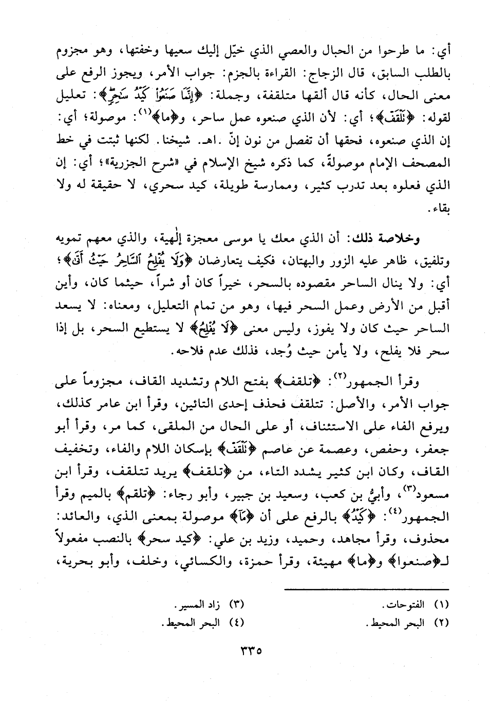 وقرأ الجمهور (¬2): {تلقف} بفتح اللام وتشديد القاف، مجزومًا على جواب الأمر، والأصل: تتلقف فحذف إحدى التائين، وقرأ ابن عامر كذلك، ويرفع الفاء على الاستئناف، أو على الحال من الملقى، كما مر، وقرأ أبو جعفر، وحفص، وعصمة عن عاصم {تَلْقَفْ} بإسكان اللام والفاء، وتخفيف القاف، وكان ابن كثير يشدد التاء، من {تلقف} يريد تتلقف، وقرأ ابن مسعود (¬3)، وأبيُّ بن كعب، وسعيد بن جبير، وأبو رجاء: {تلقم} بالميم وقرأ الجمهور (¬4): {كَيْدُ} بالرفع على أن {مَا} موصولة بمعنى الذي، والعائد: محذوف، وقرأ مجاهد، وحميد، وزيد بن علي: {كيد سحر} بالنصب مفعولًا لـ {صنعوا} و {ما} مهيئة، وقرأ حمزة، والكسائي، وخلف، وأبو بحرية،