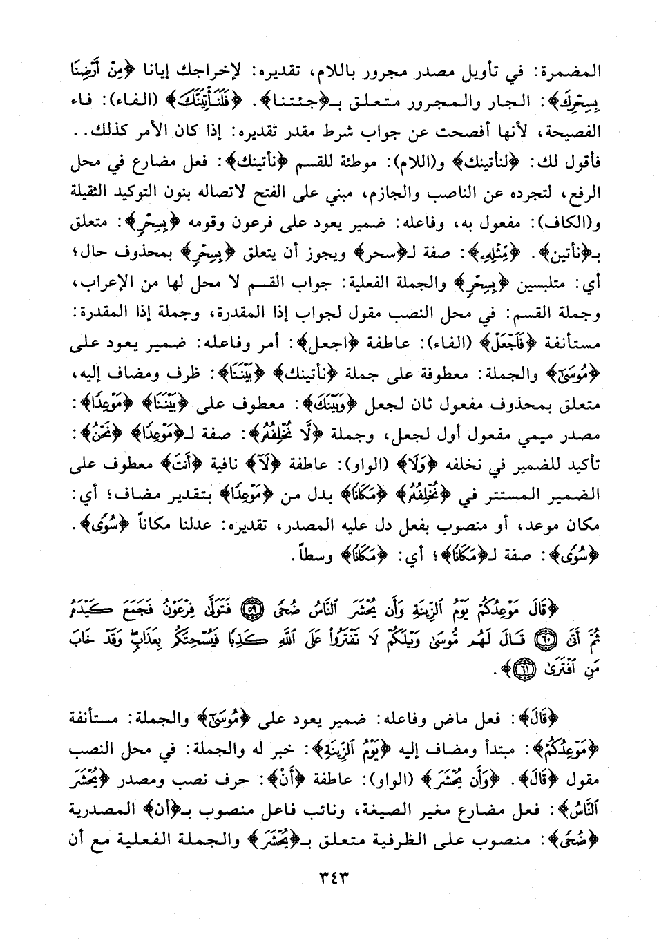 المضمرة: في تأويل مصدر مجرور باللام، تقديره: لإخراجك إيانا {مِنْ أَرْضِنَا بِسِحْرِكَ}: الجار والمجرور متعلق بـ {جئتنا}. {فَلَنَأْتِيَنَّكَ} (الفاء): فاء الفصيحة، لأنها أفصحت عن جواب شرط مقدر تقديره: إذا كان الأمر كذلك .. فأقول لك: {لنأتينك} و (اللام): موطئة للقسم {نأتينك}: فعل مضارع في محل الرفع، لتجرده عن الناصب والجازم، مبني على الفتح لاتصاله بنون التوكيد الثقيلة و (الكاف): مفعول به، وفاعله: ضمير يعود على فرعون وقومه {بِسِحْرٍ}: متعلق بـ {نأتين}. {مِثْلِهِ}: صفة لـ {سحر} ويجوز أن يتعلق {بِسِحْرٍ} بمحذوف حال, أي: متلبسين {بِسِحْرٍ} والجملة الفعلية: جواب القسم لا محل لها من الإعراب، وجملة القسم: في محل النصب مقول لجواب إذا المقدرة، وجملة إذا المقدرة: مستأنفة {فَاجْعَلْ} (الفاء): عاطفة {اجعل}: أمر وفاعله: ضمير يعود على {مُوسَى} والجملة: معطوفة على جملة {نأتينك} {بَيْنَنَا}: ظرف ومضاف إليه، متعلق بمحذوف مفعول ثان لجعل {وَبَيْنَكَ}: معطوف على {بَيْنَنَا} {مَوْعِدًا}: مصدر ميمي مفعول أول لجعل، وجملة {لَا نُخْلِفُهُ}: صفة لـ {مَوْعِدًا} {نَحْنُ}: تأكيد للضمير في نخلفه {وَلَا} (الواو): عاطفة {لَا} نافية {أَنْتَ} معطوف على الضمير المستتر في {نُخْلِفُهُ} {مَكَانًا} بدل من {مَوْعِدًا} بتقدير مضاف؛ أي: مكان موعد، أو منصوب بفعل دل عليه المصدر، تقديره: عدلنا مكانًا {سُوًى}. {سُوًى}: صفة لـ {مَكَانًا}؛ أي: {مَكَانًا} وسطًا.