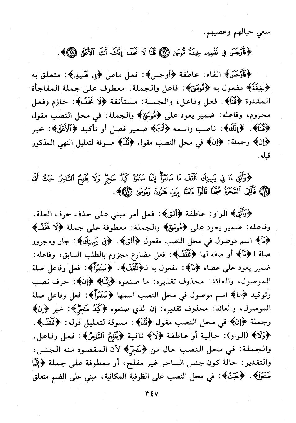 {فَأَوْجَسَ} الفاء: عاطفة {أوجس}: فعل ماض {فِي نَفْسِهِ}: متعلق به {خِيفَةً} مفعول به {مُوسَى}: فاعل والجملة: معطوف على جملة المفاجاة المقدرة {قُلْنَا}: فعل وفاعل، والجملة: مستأنفة {لَا تَخَفْ}: جازم وفعل مجزوم، وفاعله: ضمير يعود على {مُوسَى} والجملة: في محل النصب مقول {قُلْنَا}. {إِنَّكَ}: ناصب واسمه {أَنْتَ} ضمير فصل أو تأكيد {الْأَعْلَى}: خبر {إن} وجملة: {إن} في محل النصب مقول {قُلْنَا} مسوقة لتعليل النهي المذكور قبله.