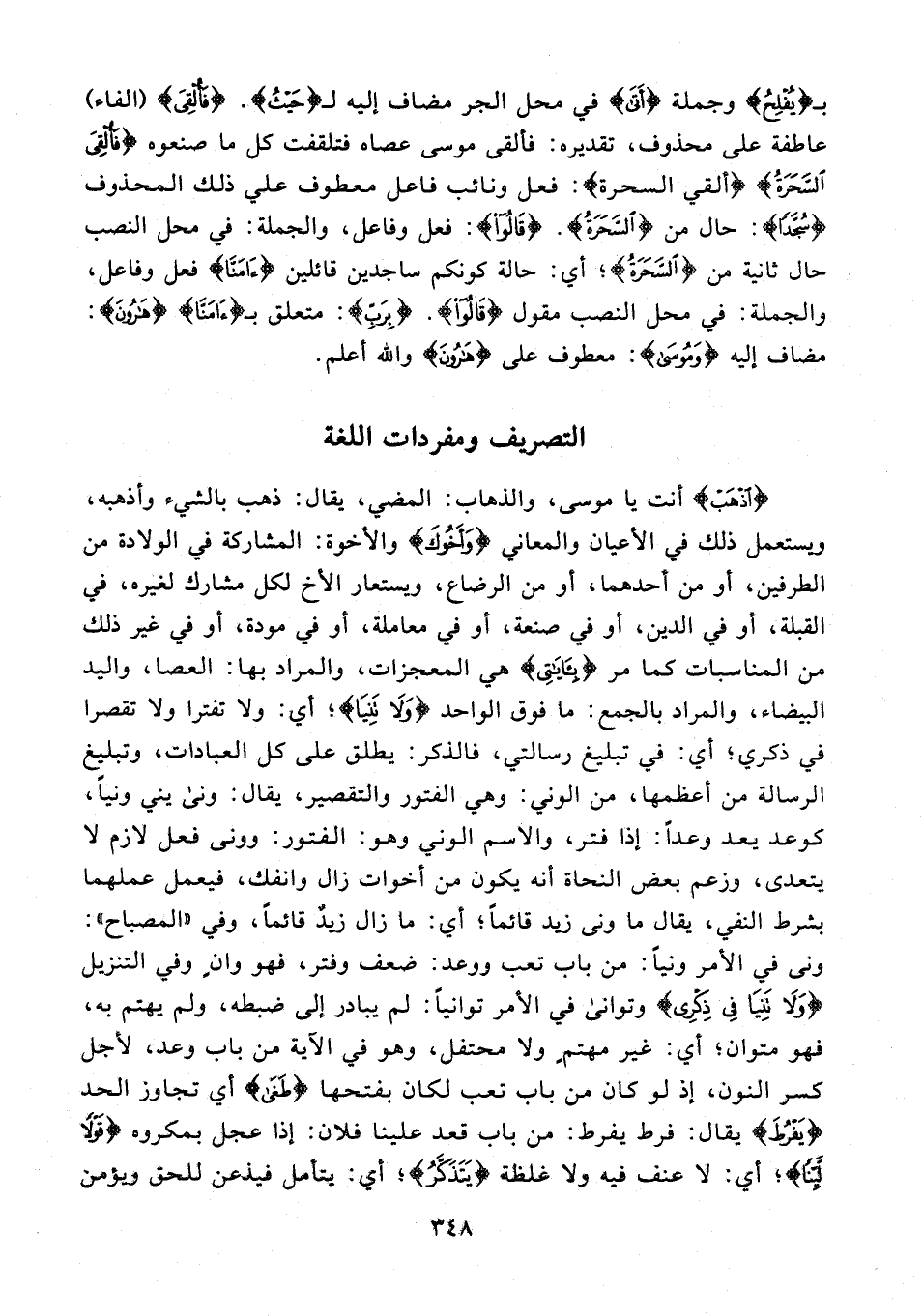 {اذْهَبْ} أنت يا موسى، والذهاب: المضي، يقال: ذهب بالشيء وأذهبه، ويسشعمل ذلك في الأعيان والمعاني {وَأَخُوكَ} والأخوة: المشاركة في الولادة من الطرفين، أو من أحدهما، أو من الرضاع، ويستعار الأخ لكل مشارك لغيره، في القبلة، أو في الدين، أو في صنعة، أو في معاملة، أو في مودة، أو في غير ذلك من المناسبات كما مر {بِآيَاتِي} هي المعجزات، والمراد بها: العصا، واليد البيضاء، والمراد بالجمع: ما فوق الواحد {وَلَا تَنِيَا}؛ أي: ولا تفترا ولا تقصرا في ذكري, أي: في تبليغ رسالتي، فالذكر: يطلق على كل العبادات، وتبليغ الرسالة من أعظمها، من الونى: وهي الفتور والتقصير، يقال: وني يني ونيًا، كوعد يعد وعدًا: إذا فتر، والاسم الوني وهو: الفتور: وونى فعل لازم لا يتعدى، وزعم بعض النحاة أنه يكون من أخوات زال وانفك، فيعمل عملهما بشرط النفي، يقال ما وفي زيد قائمًا؛ أي: ما زال زيدٌ قائمًا، وفي "المصباح": وني في الأمر ونيًا: من باب تعب ووعد: ضعف وفتر، فهو وانٍ وفي التنزيل {وَلَا تَنِيَا فِي ذِكْرِي} وتوانى في الأمر توانيًا: لم يبادر إلى ضبطه، ولم يهتم به، فهو متوان؛ أي: غير مهتمٍ ولا محتفل، وهو في الآية من باب وعد، لأجل كسر النون، إذ لو كان من باب تعب لكان بفتحها {طَغَى} أي تجاوز الحد {يَفْرُطَ} يقال: فرط يفرط: من باب قعد علينا فلان: إذا عجل بمكروه {قَوْلًا لَيِّنًا}؛ أي: لا عنف فيه ولا غلظة {يَتَذَكَّرُ}؛ في: يتأمل فيذعن للحق ويؤمن