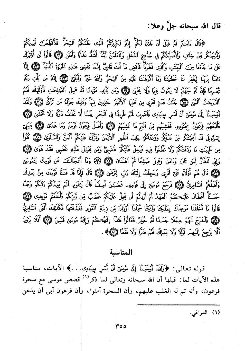 {قَالَ آمَنْتُمْ لَهُ قَبْلَ أَنْ آذَنَ لَكُمْ إِنَّهُ لَكَبِيرُكُمُ الَّذِي عَلَّمَكُمُ السِّحْرَ فَلَأُقَطِّعَنَّ أَيْدِيَكُمْ وَأَرْجُلَكُمْ مِنْ خِلَافٍ وَلَأُصَلِّبَنَّكُمْ فِي جُذُوعِ النَّخْلِ وَلَتَعْلَمُنَّ أَيُّنَا أَشَدُّ عَذَابًا وَأَبْقَى (71) قَالُوا لَنْ نُؤْثِرَكَ عَلَى مَا جَاءَنَا مِنَ الْبَيِّنَاتِ وَالَّذِي فَطَرَنَا فَاقْضِ مَا أَنْتَ قَاضٍ إِنَّمَا تَقْضِي هَذِهِ الْحَيَاةَ الدُّنْيَا (72) إِنَّا آمَنَّا بِرَبِّنَا لِيَغْفِرَ لَنَا خَطَايَانَا وَمَا أَكْرَهْتَنَا عَلَيْهِ مِنَ السِّحْرِ وَاللَّهُ خَيْرٌ وَأَبْقَى (73) إِنَّهُ مَنْ يَأْتِ رَبَّهُ مُجْرِمًا فَإِنَّ لَهُ جَهَنَّمَ لَا يَمُوتُ فِيهَا وَلَا يَحْيَى (74) وَمَنْ يَأْتِهِ مُؤْمِنًا قَدْ عَمِلَ الصَّالِحَاتِ فَأُولَئِكَ لَهُمُ الدَّرَجَاتُ الْعُلَى (75) جَنَّاتُ عَدْنٍ تَجْرِي مِنْ تَحْتِهَا الْأَنْهَارُ خَالِدِينَ فِيهَا وَذَلِكَ جَزَاءُ مَنْ تَزَكَّى (76) وَلَقَدْ أَوْحَيْنَا إِلَى مُوسَى أَنْ أَسْرِ بِعِبَادِي فَاضْرِبْ لَهُمْ طَرِيقًا فِي الْبَحْرِ يَبَسًا لَا تَخَافُ دَرَكًا وَلَا تَخْشَى (77) فَأَتْبَعَهُمْ فِرْعَوْنُ بِجُنُودِهِ فَغَشِيَهُمْ مِنَ الْيَمِّ مَا غَشِيَهُمْ (78) وَأَضَلَّ فِرْعَوْنُ قَوْمَهُ وَمَا هَدَى (79) يَا بَنِي إِسْرَائِيلَ قَدْ أَنْجَيْنَاكُمْ مِنْ عَدُوِّكُمْ وَوَاعَدْنَاكُمْ جَانِبَ الطُّورِ الْأَيْمَنَ وَنَزَّلْنَا عَلَيْكُمُ الْمَنَّ وَالسَّلْوَى (80) كُلُوا مِنْ طَيِّبَاتِ مَا رَزَقْنَاكُمْ وَلَا تَطْغَوْا فِيهِ فَيَحِلَّ عَلَيْكُمْ غَضَبِي وَمَنْ يَحْلِلْ عَلَيْهِ غَضَبِي فَقَدْ هَوَى (81) وَإِنِّي لَغَفَّارٌ لِمَنْ تَابَ وَآمَنَ وَعَمِلَ صَالِحًا ثُمَّ اهْتَدَى (82) وَمَا أَعْجَلَكَ عَنْ قَوْمِكَ يَا مُوسَى (83) قَالَ هُمْ أُولَاءِ عَلَى أَثَرِي وَعَجِلْتُ إِلَيْكَ رَبِّ لِتَرْضَى (84) قَالَ فَإِنَّا قَدْ فَتَنَّا قَوْمَكَ مِنْ بَعْدِكَ وَأَضَلَّهُمُ السَّامِرِيُّ (85) فَرَجَعَ مُوسَى إِلَى قَوْمِهِ غَضْبَانَ أَسِفًا قَالَ يَا قَوْمِ أَلَمْ يَعِدْكُمْ رَبُّكُمْ وَعْدًا حَسَنًا أَفَطَالَ عَلَيْكُمُ الْعَهْدُ أَمْ أَرَدْتُمْ أَنْ يَحِلَّ عَلَيْكُمْ غَضَبٌ مِنْ رَبِّكُمْ فَأَخْلَفْتُمْ مَوْعِدِي (86) قَالُوا مَا أَخْلَفْنَا مَوْعِدَكَ بِمَلْكِنَا وَلَكِنَّا حُمِّلْنَا أَوْزَارًا مِنْ زِينَةِ الْقَوْمِ فَقَذَفْنَاهَا فَكَذَلِكَ أَلْقَى السَّامِرِيُّ (87) فَأَخْرَجَ لَهُمْ عِجْلًا جَسَدًا لَهُ خُوَارٌ فَقَالُوا هَذَا إِلَهُكُمْ وَإِلَهُ مُوسَى فَنَسِيَ (88) أَفَلَا يَرَوْنَ أَلَّا يَرْجِعُ إِلَيْهِمْ قَوْلًا وَلَا يَمْلِكُ لَهُمْ ضَرًّا وَلَا نَفْعًا (89)}.
