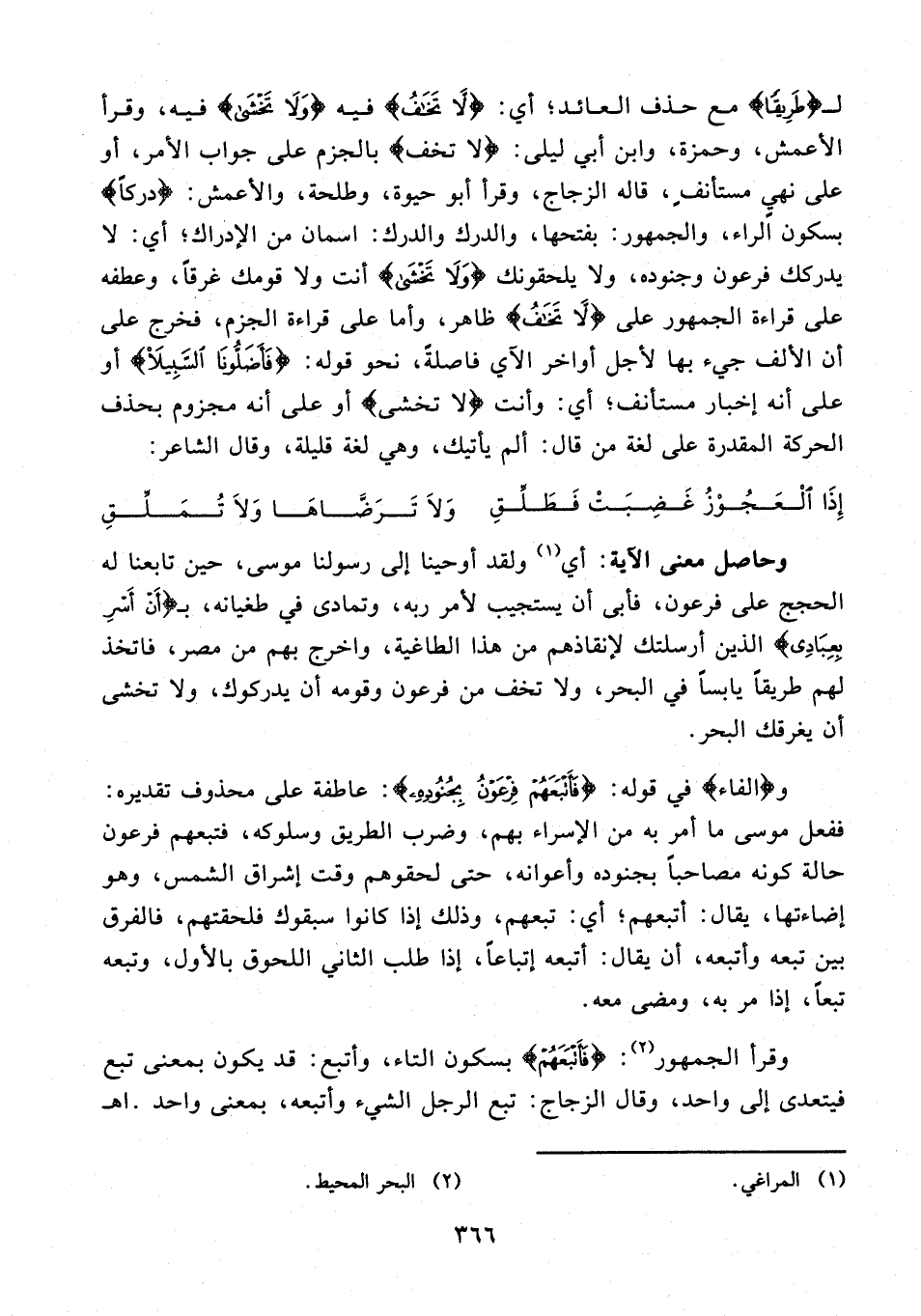 لـ {طَرِيقًا} مع حذف العائد؛ أي: {لَا تَخَافُ} فيه {وَلَا تَخْشَى} فيه، وقرأ الأعمش، وحمزة، وابن أبي ليلى: {لا تخف} بالجزم على جواب الأمر، أو على نهيٍ مستأنفٍ، قاله الزجاج، وقرأ أبو حيوة، وطلحة، والأعمش: {دركاً} بسكون الراء، والجمهور: بفتحها، والدرك والدرك: اسمان من الإدراك؛ أي: لا يدركك فرعون وجنوده، ولا يلحقونك {وَلَا تَخْشَى} أنت ولا قومك غرقاً، وعطفه على قراءة الجمهور على {لَا تَخَافُ} ظاهر، وأما على قراءة الجزم، فخرج على أن الألف جيء بها لأجل أواخر الآي فاصلةً، نحو قوله: {فَأَضَلُّونَا السَّبِيلَا} أو على أنه إخبار مستأنف؛ أي: وأنت {لا تخشى} أو على أنه مجزوم بحذف الحركة المقدرة على لغة من قال: ألم يأتيك، وهي لغة قليلة، وقال الشاعر: