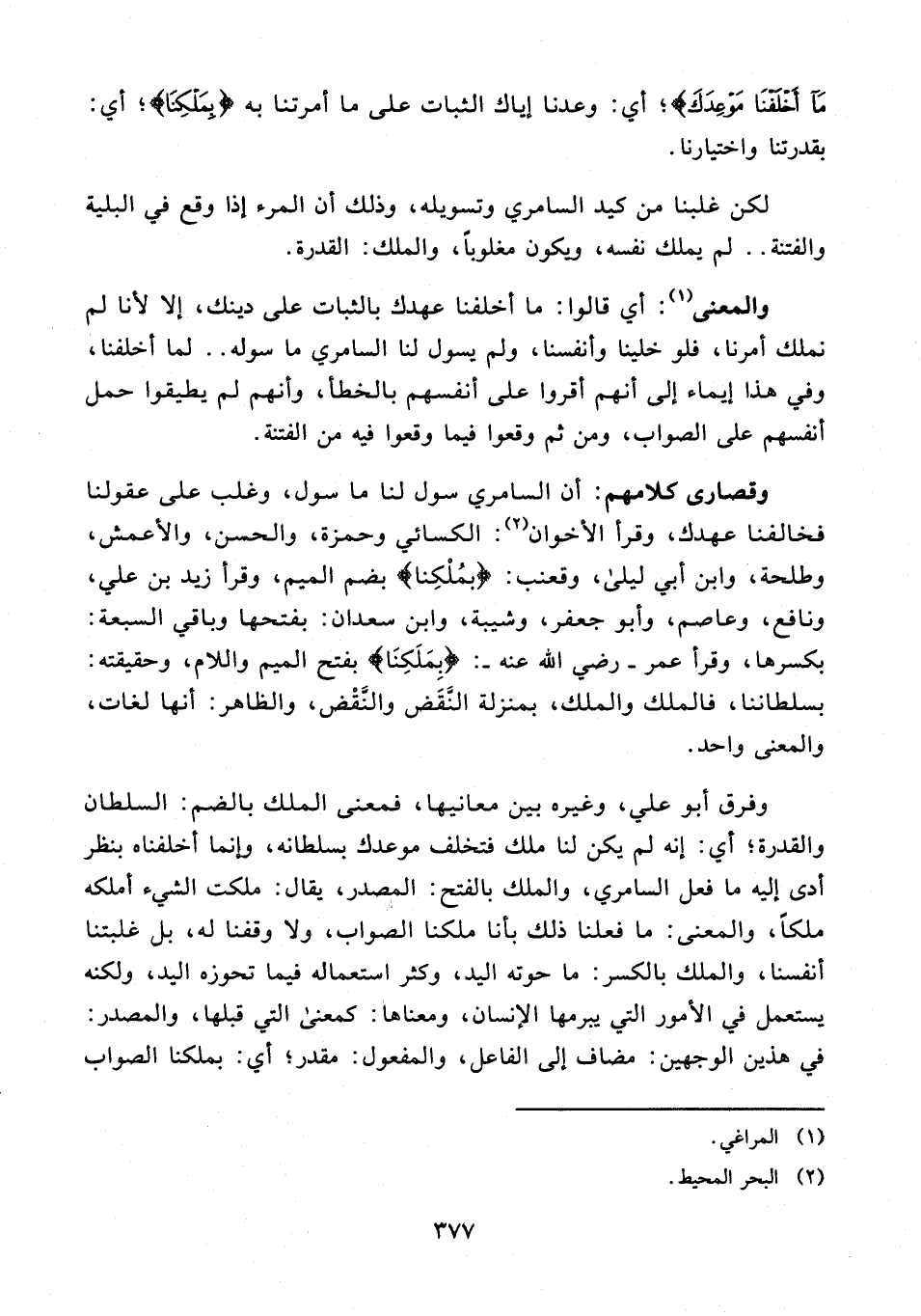 وفرق أبو علي، وغيره بين معانيها، فمعنى الملك بالضم: السلطان والقدرة؛ أي: إنه لم يكن لنا ملك فتخلف موعدك بسلطانه، وإنما أخلفناه بنظر أدى إليه ما فعل السامري، والملك بالفتح: المصدر، يقال: ملكت الشيء أملكه ملكًا، والمعنى: ما فعلنا ذلك بأنا ملكنا الصواب، ولا وقفنا له، بل غلبتنا أنفسنا، والملك بالكسر: ما حوته اليد، وكثر استعماله فيما تحوزه اليد، ولكنه يستعمل في الأمور التي يبرمها الإنسان، ومعناها: كمعنى التي قبلها، والمصدر: في هذين الوجهين: مضاف إلى الفاعل، والمفعول: مقدر؛ أي: بملكنا الصواب