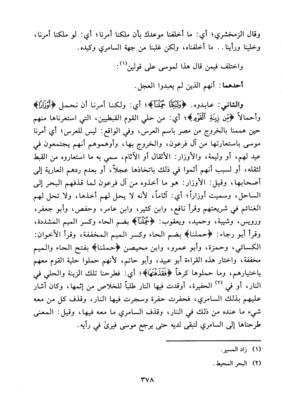 والثانى: عابدوه. {وَلَكِنَّا حُمِّلْنَا}؛ أي: ولكنا أمرنا أن نحمل {أَوْزَارًا} وأحمالاً {مِنْ زِينَةِ الْقَوْمِ}؛ أي: من حلي القوم القبطيين، التي استعرناها منهم حين هممنا بالخروج من مصر باسم العرس، وفي الواقع: ليس للعرس؛ أي أمرنا موسى باستعارتها من آل فرعون، والخروج بها، وأوهموهم أنهم يجتمعون في عيد لهم، أو وليمة، والأوزار: الأثقال أو الآثام، سمي به ما استعاروه من القبط لثقله، أو لسبب أنهم أثموا في ذلك باتخاذها عجلًا، أو بعدم ردهم العارية إلى أصحابها، وقيل: الأوزار: هو ما أخذوه من آل فرعون لما قذفهم البحر إلى الساحل، وسميت أوزارًا؛ أي: آثامًا؛ لأنه لا يحل لهم أخذها، ولا تحل لهم الغنائم في شريعتهم وقرأ نافع، وابن كثير، وابن عامر، وحفص، وأبو جعفر، ورويس، وشيبة، وحميد، ويعقوب: {حُمِّلْنَا} بضم الحاء وكسر الميم المشددة، وقرأ أبو رجاء: {حملنا} بضم الحاء وكسر الميم المخففة، وقرأ الأخوان: الكسائي، وحمزة، وأبو عمرو، وابن محيصن {حملنا} بفتح الحاء والميم مخففة، واختار هذه القراءة أبو عبيد، وأبو حاتم؛ لأنهم حملوا حلية القوم معهم باختيارهم، وما حملوها كرهًا {فَقَذَفْنَاهَا}؛ أي: فطرحنا تلك الزينة والحلي في النار، أو في (¬2) الحفيرة، أوقدت فيها النار طلبًا للخلاص من إثمها، وكان أشار عليهم بذلك السامري، فحفرت حفرة وسجرت فيها النار، وقذف كل من معه شيء ما عنده من ذلك في النار، وقذت السامري ما معه فيها، وقيل: المعنى طرحناها إلى السامري لتبقى لديه حتى يرجع موسى فيرى في رأيه.