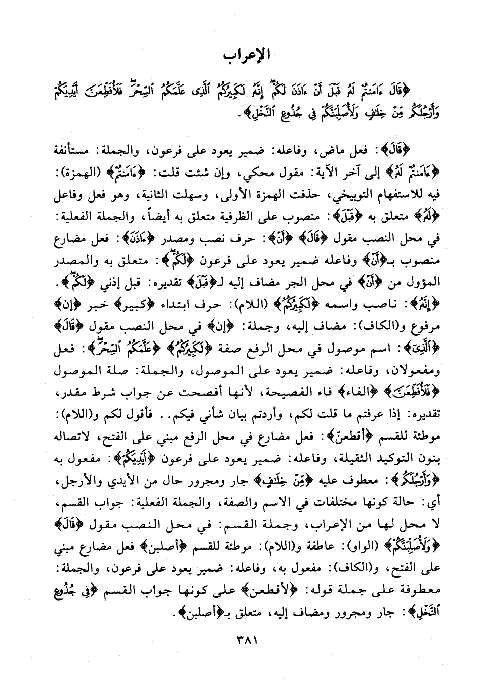 {قَالَ}: فعل ماض، وفاعله: ضمير يعود على فرعون، والجملة: مستأنفة {آمَنْتُمْ لَهُ} إلى آخر الآية: مقول محكي، وإن شئت قلت: {آمَنْتُمْ} (الهمزة): فيه للاستفهام التوبيخي، حذفت الهمزة الأولى، وسهلت الثانية، وهو فعل وفاعل {لَهُ} متعلق به {قَبْلَ}: منصوب على الظرفية متعلق به أيضًا، والجملة الفعلية: في محل النصب مقول {قَالَ} {أَنْ}: حرف نصب ومصدر {آذَنَ}: فعل مضارع منصوب بـ {أَنْ} وفاعله ضمير يعود على فرعون {لَكُمْ}: متعلق به والمصدر المؤول من {أَنْ} في محل الجر مضاف إليه لـ {قَبْلَ} تقديره: قبل إذني {لَكُمْ}. {إِنَّهُ}: ناصب واسمه {لَكَبِيرُكُمُ} (اللام): حرف ابتداء {كبير} خبر {إن} مرفوع و (الكاف): مضاف إليه، وجملة: {إن} في محل النصب مقول {قَالَ} {الَّذِي}: اسم موصول في محل الرفع صفة {لَكَبِيرُكُمُ} {عَلَّمَكُمُ السِّحْرَ}: فعل ومفعولان، وفاعله: ضمير يعود على الموصول، والجمله: صلة الموصول {فَلَأُقَطِّعَنَّ} {الفاء} فاء الفصيحة؛ لأنها أفصحت عن جواب شرط مقدر، تقديره: إذا عرفتم ما قلت لكم، وأردتم بيان شأني فيكم .. فأقول لكم و (اللام): موطئة للقسم {أقطعنّ}: فعل مضارع في محل الرفع مبني على الفتح، لاتصاله بنون التوكيد الثقيلة، وفاعله: ضمير يعود على فرعون {أَيْدِيَكُمْ}: مفعول به {وَأَرْجُلَكُمْ}: معطوف عليه {مِنْ خِلَافٍ} جار ومجرور حال من الأيدي والأرجل، أي: حالة كونها مختلفات في الاسم والصفة، والجملة الفعلية: جواب القسم، لا محل لها من الإعراب، وجملة القسم: في محل النصب مقول {قَالَ} {وَلَأُصَلِّبَنَّكُمْ} (الواو): عاطفة و (اللام): موطئة للقسم {أصلبن} فعل مضارع مبني على الفتح، و (الكاف): مفعول به، وفاعله: ضمير يعود على فرعون، والجملة: معطوفة على جملة قوله: {لأقطعن} علي كونها جواب القسم {فِي جُذُوعِ النَّخْلِ}: جار ومجرور ومضاف إليه، متعلق بـ {أصلبن}.