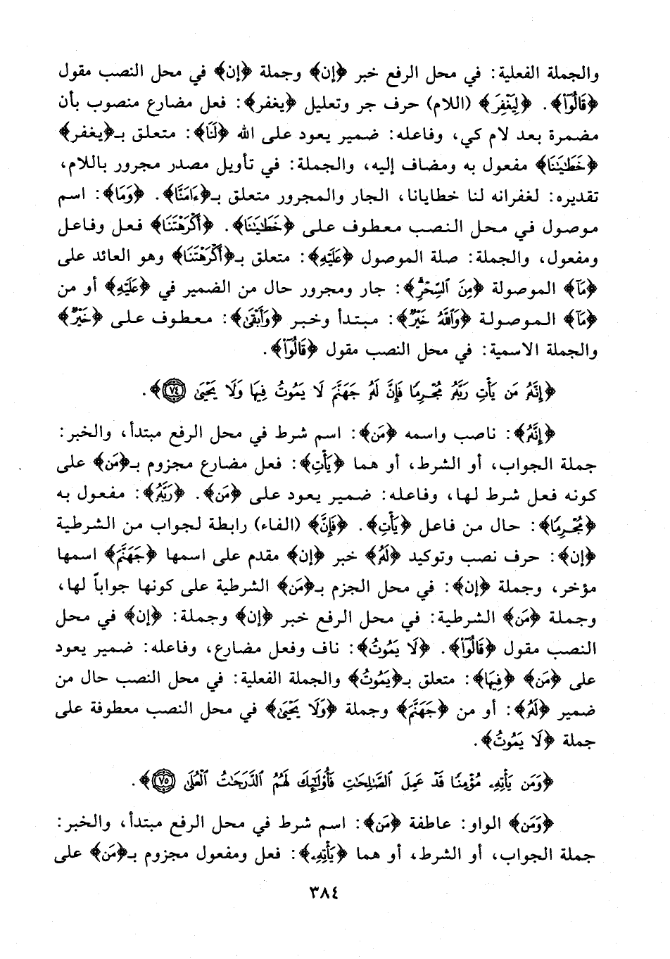 {إِنَّهُ}: ناصب واسمه {مَنْ}: اسم شرط في محل الرفع مبتدأ، والخبر: جملة الجواب، أو الشرط، أو هما {يَأْتِ}: فعل مضارع مجزوم بـ {مَنْ} على كونه فعل شرط لها، وفاعله: ضمير يعود على {مَنْ}. {رَبَّهُ}: مفعول به {مُجْرِمًا}: حال من فاعل {يَأْتِ}. {فَإِنَّ} (الفاء) رابطة لجواب من الشرطية {إن}: حرف نصب وتوكيد {لَهُ} خبر {إن} مقدم على اسمها {جَهَنَّمَ} اسمها مؤخر، وجملة {إن}: في محل الجزم بـ {مَنْ} الشرطية على كونها جوابًا لها، وجملة {مَنْ} الشرطية: في محل الرفع خبر {إن} وجملة: {إن} في محل النصب مقول {قَالُوا}. {لَا يَمُوت}: ناف وفعل مضارع، وفاعله: ضمير يعود على {مَنْ} {فِيهَا}: متعلق بـ {يَمُوتُ} والجملة الفعلية: في محل النصب حال من ضمير {لَهُ}: أو من {جَهَنَّمَ} وجملة {وَلَا يَحْيَى} في محل النصب معطوفة على جملة {لَا يَمُوتُ}.