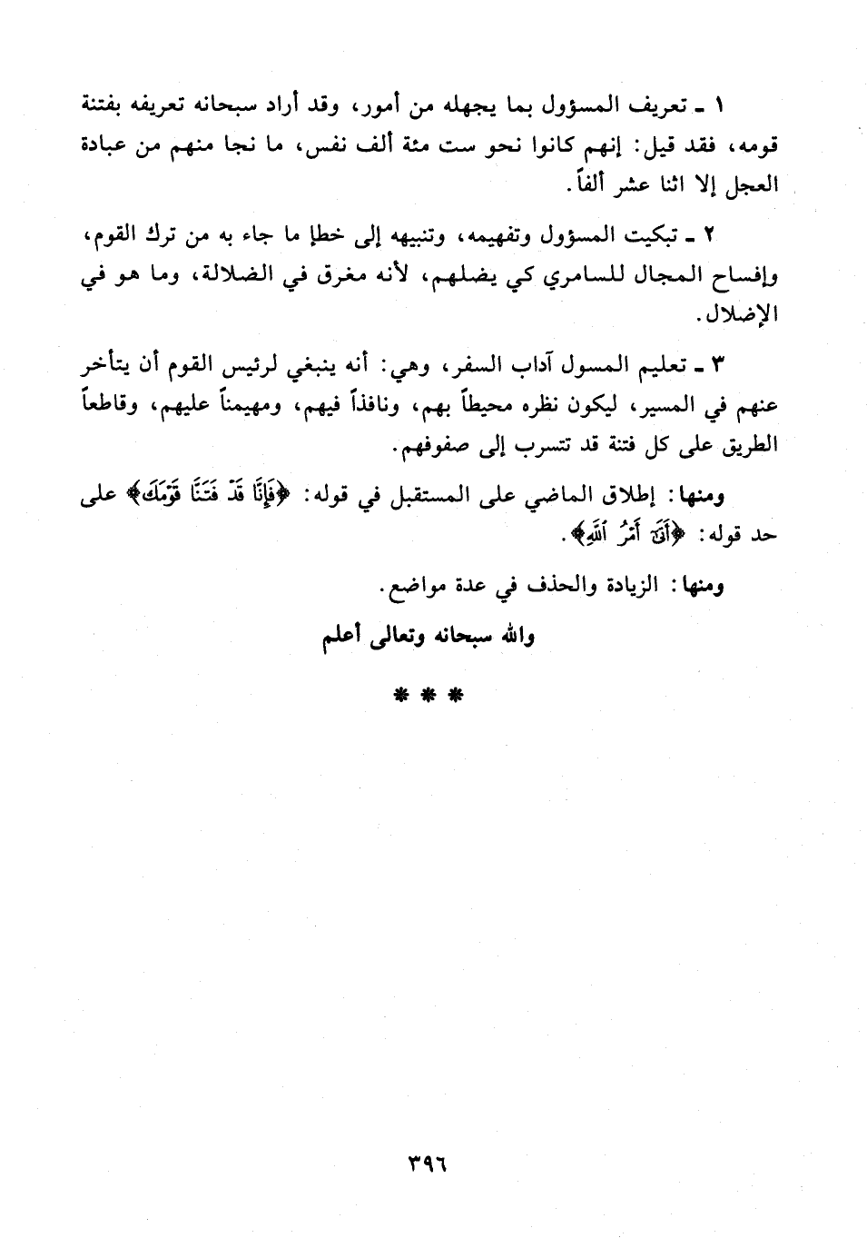 1 - تعريف المسؤول بما يجهله من أمور، وقد أراد سبحانه تعريفه بفتنة قومه، فقد قيل: إنهم كانوا نحو ست مئة ألف نفس، ما نجا منهم من عبادة العجل إلا اثنا عشر ألفًا.
