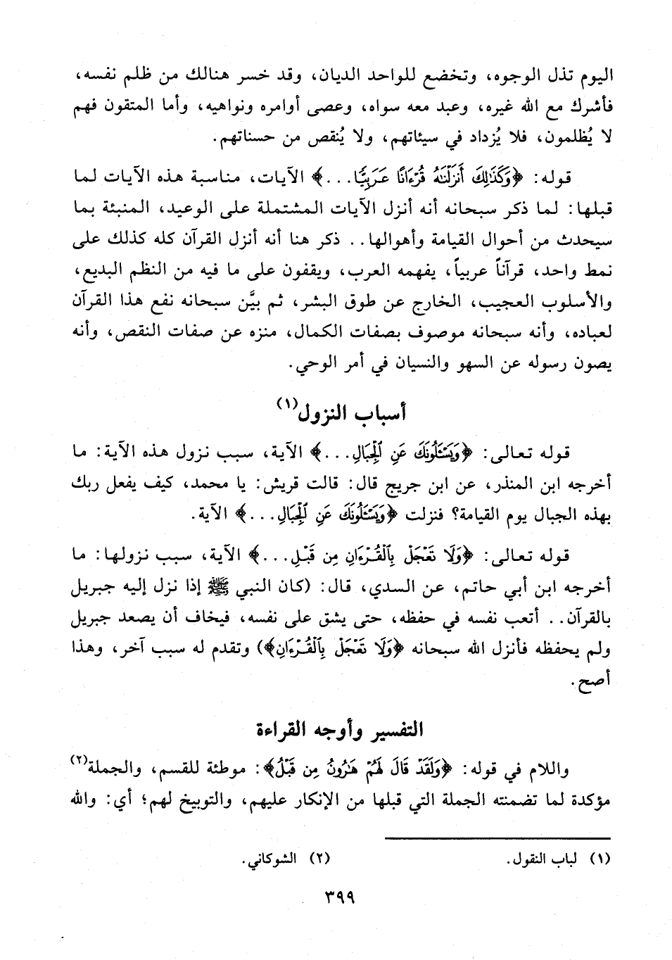 قوله: {وَكَذَلِكَ أَنْزَلْنَاهُ قُرْآنًا عَرَبِيًّا ...} الآيات، مناسبة هذه الآيات لما قبلها: لما ذكر سبحانه أنه أنزل الآيات المشتملة على الوعيد، المنبئة بما سيحدث من أحوال القيامة وأهوالها .. ذكر هنا أنه أنزل القرآن كله كذلك على نمط واحد، قرآنًا عربيًا، يفهمه العرب، ويقفون على ما فيه من النظم البديع، والأسلوب العجيب، الخارج عن طوق البشر، ثم بيَّن سبحانه نفع هذا القرآن لعباده، وأنه سبحانه موصوف بصفات الكمال، منزه عن صفات النقص، وأنه يصون رسوله عن السهو والنسيان في أمر الوحي.
