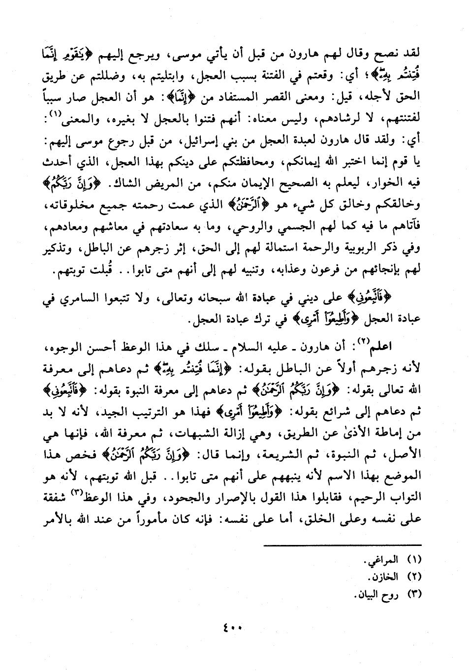 اعلم (¬2): أن هارون - عليه السلام - سلك في هذا الوعظ أحسن الوجوه، لأنه زجرهم أولًا عن الباطل بقوله: {إِنَّمَا فُتِنْتُمْ بِهِ} ثم دعاهم إلى معرفة الله تعالى بقوله: {وَإِنَّ رَبَّكُمُ الرَّحْمَنُ} ثم دعاهم إلى معرفة النبوة بقوله: {فَاتَّبِعُونِي} ثم دعاهم إلى شرائع بقوله: {وَأَطِيعُوا أَمْرِي} فهذا هو الترتيب الجيد؛ لأنه لا بد من إماطة الأذى عن الطريق، وهي إزالة الشبهات، ثم معرفة الله، فإنها هي الأصل، ثم النبوة، ثم الشريعة، وإنما قال: {وَإِنَّ رَبَّكُمُ الرَّحْمَنُ} فخص هذا الموضع بهذا الاسم لأنه ينبههم على أنهم متى تابوا .. قبل الله توبتهم؛ لأنه هو التواب الرحيم، فقابلوا هذا القول بالإصرار والجحود، وفي هذا الوعظ (¬3) شفقة على نفسه وعلى الخلق، أما على نفسه: فإنه كان مأمورًا من عند الله بالأمر