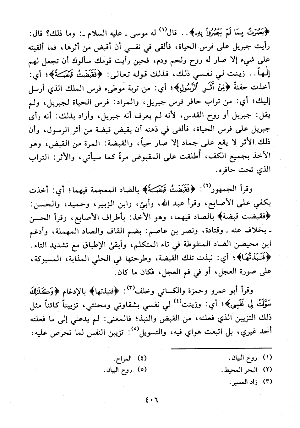 وقرأ الجمهور (¬2): {فَقَبَضْتُ قَبْضَةً} بالضاد المعجمة فيهما؛ أي: أخذت بكفي على الأصابع، وقرأ عبد الله، وأبيّ، وابن الزبير، وحميد، والحسن: {فقبضت قبضة} بالصاد فيهما، وهو الأخذ: بأطراف الأصابع، وقرأ الحسن - بخلاف عنه - وقتادة، ونصر بن عاصم: بضم القاف والصاد المهملة، وأدغم ابن محيصن الضاد المنقوطة في تاء المتكلم، وأبقى الإطباق مع تشديد التاء. {فَنَبَذْتُهَا}؛ أي: نبذت تلك القبضة، وطرحتها في الحلي المذابة، المسبوكة، على صورة العجل، أو في فم العجل، فكان ما كان.