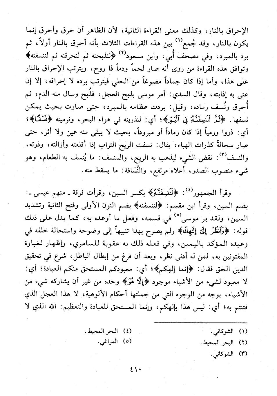 وقرأ الجمهور (¬4): {لَنَنْسِفَنَّهُ} بكسر السين، وقرأت فرقة - منهم عيسى -: بضم السين، وقرأ ابن مقسم: {لننسفنه} بضم النون الأولى وفتح الثانية وتشديد السين، ولقد بر موسى (¬5) في قسمه، وفعل ما أوعده به، كما يدل على ذلك قوله: {وَانْظُرْ إِلَى إِلَهِك} ولم يصرح بهذا تنبيهًا إلى وضوحه واستحالة خلفه في وعيده المؤكد باليمين، وفي فعله ذلك به عقوبة للسامري، وإظهار لغباوة المفتونين به، لمن له أدنى نظر،
