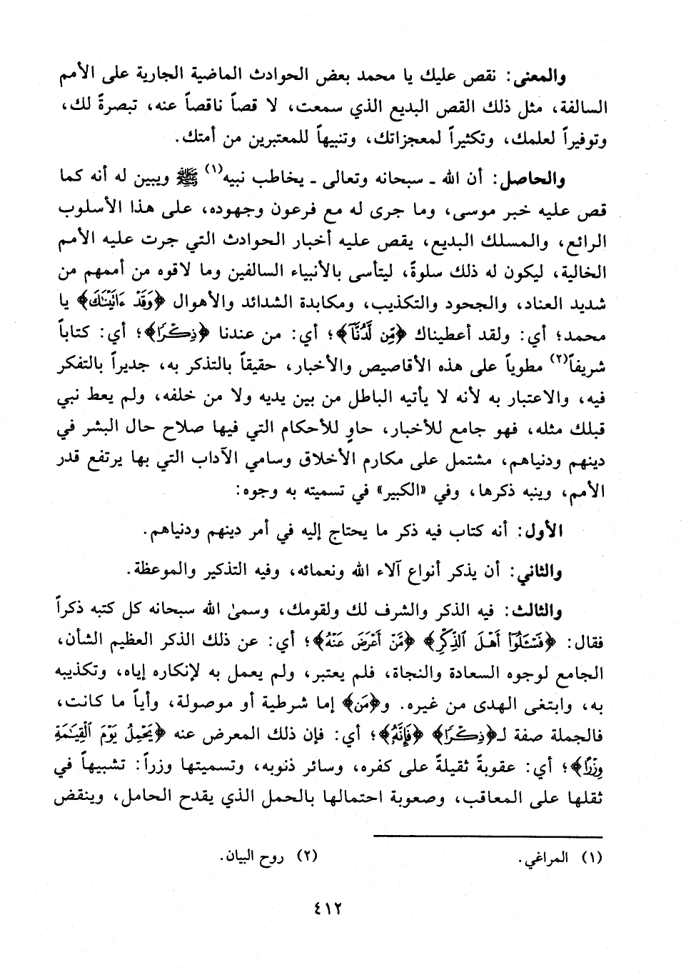 والمعنى: نقص عليك يا محمد بعض الحوادث الماضية الجارية على الأمم السالفة، مثل ذلك القص البديع الذي سمعت، لا قصًا ناقصًا عنه، تبصرةً لك، وتوفيرًا لعلمك، وتكثيرًا لمعجزاتك، وتنبيهًا للمعتبرين من أمتك.
