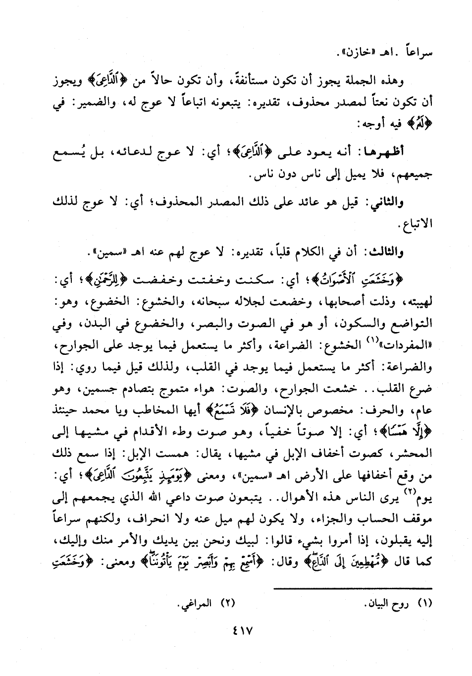 {وَخَشَعَتِ الْأَصْوَاتُ}؛ أي: سكنت وخفتت وخفضت {لِلرَّحْمَنِ}؛ أي: لهيبته، وذلت أصحابها، وخضعت لجلاله سبحانه، والخشوع: الخضوع، وهو: التواضع والسكون، أو هو في الصوت والبصر، والخضوع في البدن، وفي "المفردات" (¬1) الخشوع: الضراعة، وأكثر ما يستعمل فيما يوجد على الجوارح، والضراعة: أكثر ما يستعمل فيما يوجد في القلب، ولذلك قيل فيما روي: إذا ضرع القلب .. خشعت الجوارح، والصوت: هواء متموج بتصادم جسمين، وهو عام، والحرف: مخصوص بالإنسان {فَلَا تَسْمَعُ} أيها المخاطب ويا محمد حينئذ {إِلَّا هَمْسًا}؛ أي: إلا صوتًا خفيًا، وهو صوت وطء الأقدام في مشيها إلى المحشر، كصوت أخفاف الإبل في مشيها، يقال: همست الإبل: إذا سمع ذلك من وقع أخفافها على الأرض اهـ "سمين"، ومعنى {يَوْمَئِذٍ يَتَّبِعُونَ الدَّاعِيَ}؛ أي: يوم (¬2) يرى الناس هذه الأهوال .. يتبعون صوت داعي الله الذي يجمعهم إلى موقف الحساب والجزاء، ولا يكون لهم ميل عنه ولا انحراف، ولكنهم سراعًا إليه يقبلون، إذا أمروا بشيء قالوا: لبيك ونحن بين يديك والأمر منك وإليك، كما قال {مُهْطِعِينَ إِلَى الدَّاعِ} وقال: {أَسْمِعْ بِهِمْ وَأَبْصِرْ يَوْمَ يَأْتُونَنَا} ومعنى: {وَخَشَعَتِ