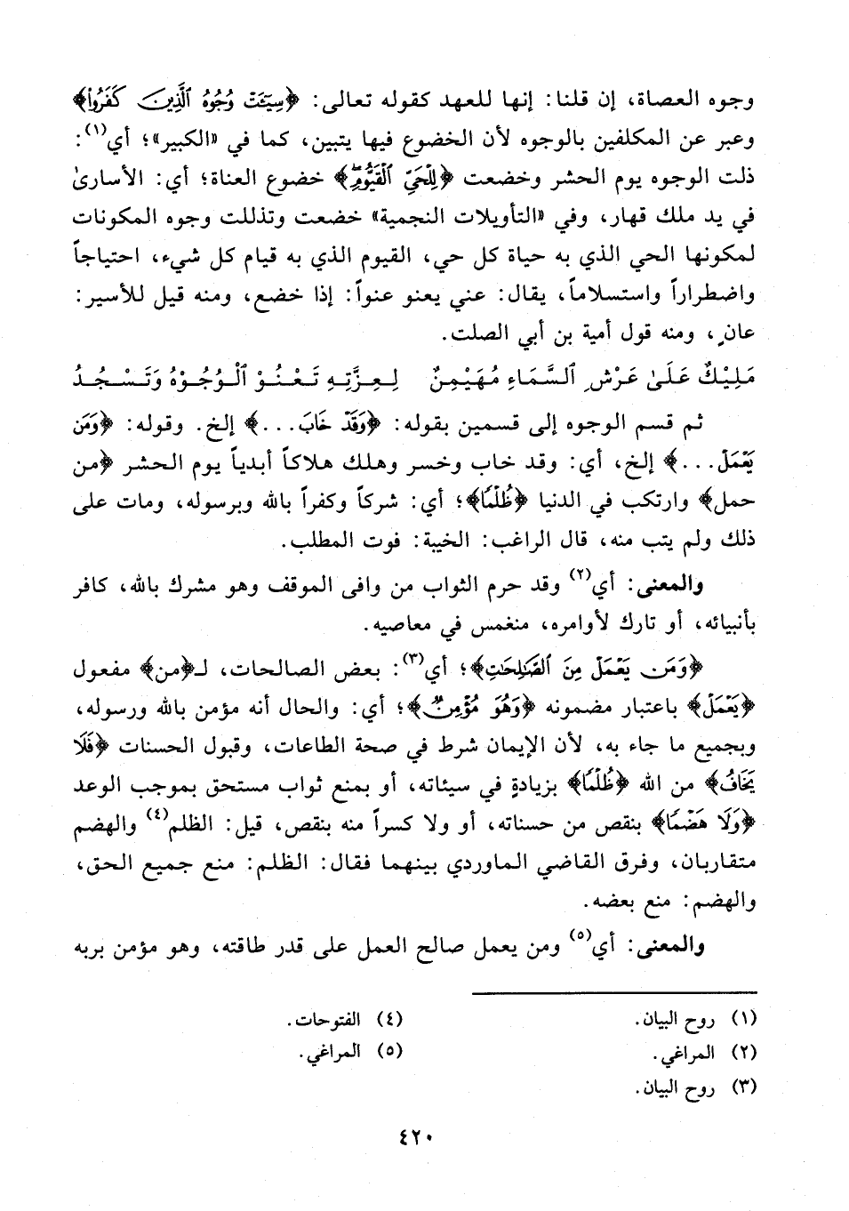 وجوه العصاة، إن قلنا: إنها للعهد كقوله تعالى: {سِيئَتْ وُجُوهُ الَّذِينَ كَفَرُوا} وعبر عن المكلفين بالوجوه لأن الخضوع فيها يتبين، كما في "الكبير"؛ أي (¬1): ذلت الوجوه يوم الحشر وخضعت {لِلْحَيِّ الْقَيُّومِ} خضوع العناة؛ أي: الأسارى في يد ملك قهار، وفي "التأويلات النجمية" خضعت وتذللت وجوه المكونات لمكونها الحي الذي به حياة كل حي، القيوم الذي به قيام كل شيء، احتياجًا واضطرارًا واستسلامًا، يقال: عني يعنو عنوًا: إذا خضع، ومنه قيل للأسير: عانٍ، ومنه قول أمية بن أبي الصلت.