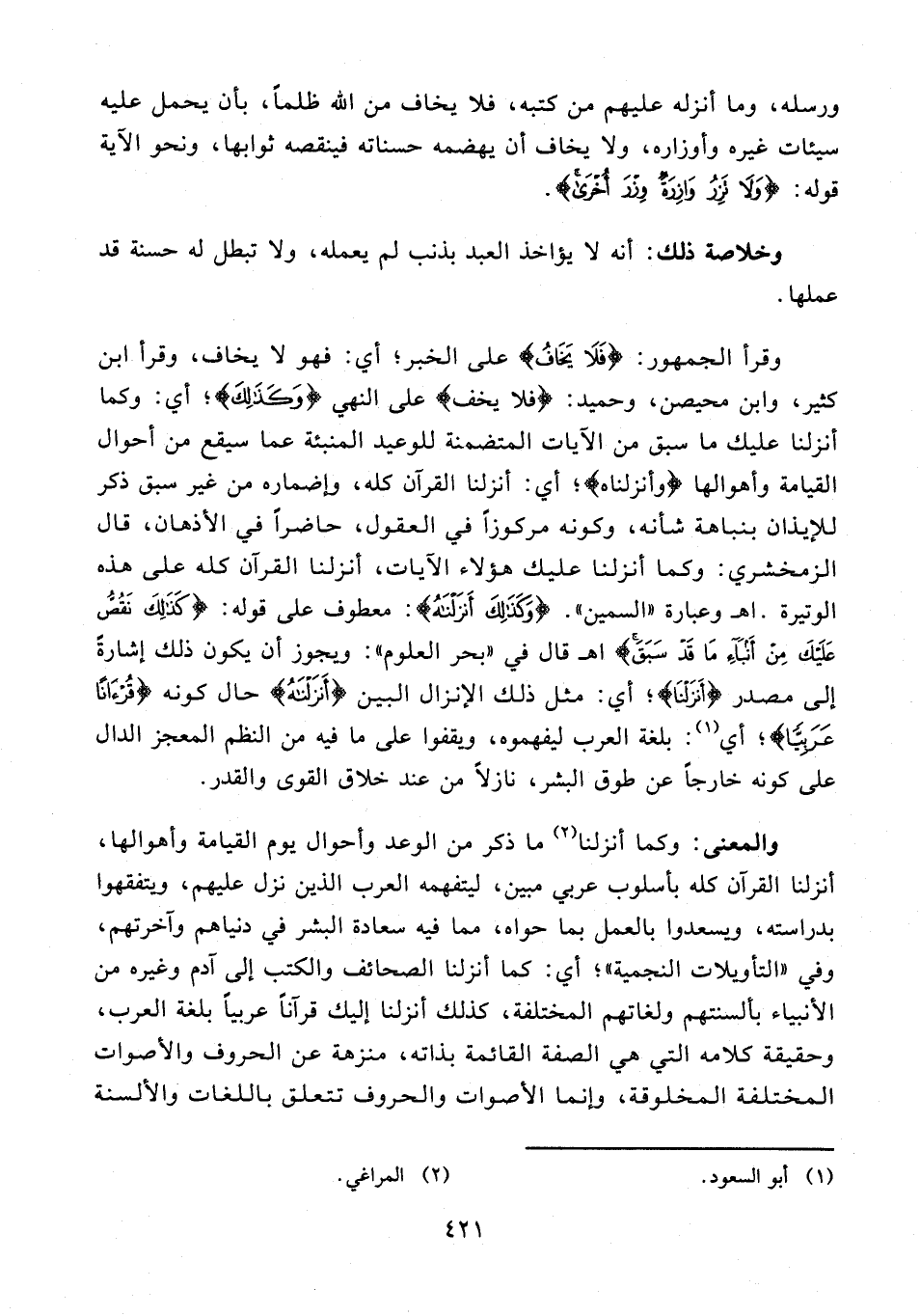 والمعنى: وكما أنزلنا (¬2) ما ذكر من الوعد وأحوال يوم القيامة وأهوالها، أنزلنا القرآن كله بأسلوب عربي مبين، ليتفهمه العرب الذين نزل عليهم، ويتفقهوا بدراسته، ويسعدوا بالعمل بما حواه، مما فيه سعادة البشر في دنياهم وآخرتهم، وفي "التأويلات النجمية"؛ أي: كما أنزلنا الصحائف والكتب إلى آدم وغيره من الأنبياء بألسنتهم ولغاتهم المختلفة، كذلك أنزلنا إليك قرآنًا عربيًا بلغة العرب، وحقيقة كلامه التي هي الصفة القائمة بذاته، منزهة عن الحروف والأصوات المختلفة المخلوقة، وإنما الأصوات والحروف تتعلق باللغات والألسنة