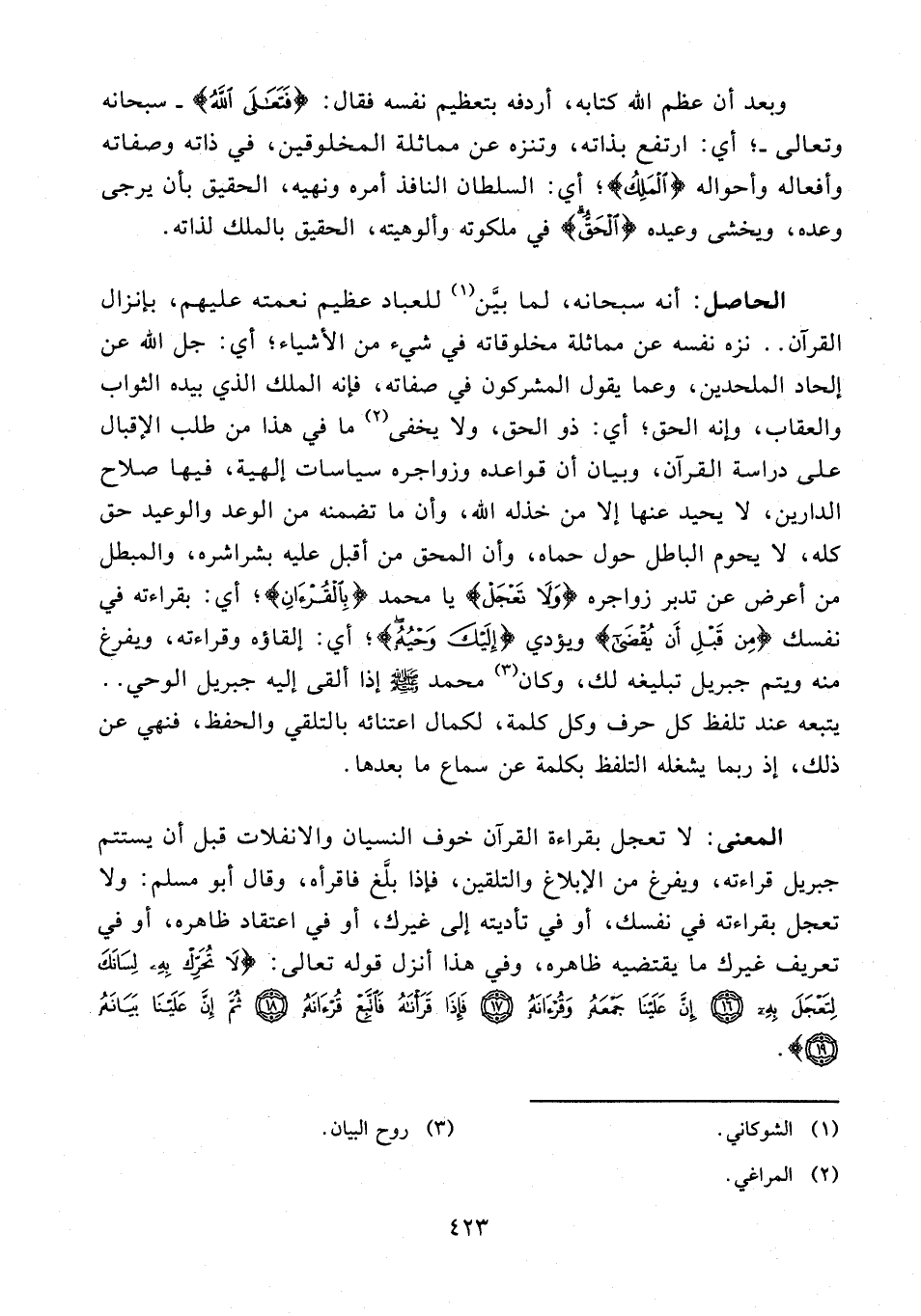المعنى: لا تعجل بقراءة القرآن خوف النسيان والانفلات قبل أن يستتم جبريل قراءته، ويفرغ من الإبلاغ والتلقين، فإذا بلَّغ فاقرأه، وقال أبو مسلم: ولا تعجل بقراءته في نفسك، أو في تأديته إلى غيرك، أو في اعتقاد ظاهره، أو في تعريف غيرك ما يقتضيه ظاهره، وفي هذا أنزل قوله تعالى: {لَا تُحَرِّكْ بِهِ لِسَانَكَ لِتَعْجَلَ بِهِ (16) إِنَّ عَلَيْنَا جَمْعَهُ وَقُرْآنَهُ (17) فَإِذَا قَرَأْنَاهُ فَاتَّبِعْ قُرْآنَهُ (18) ثُمَّ إِنَّ عَلَيْنَا بَيَانَهُ (19)}.