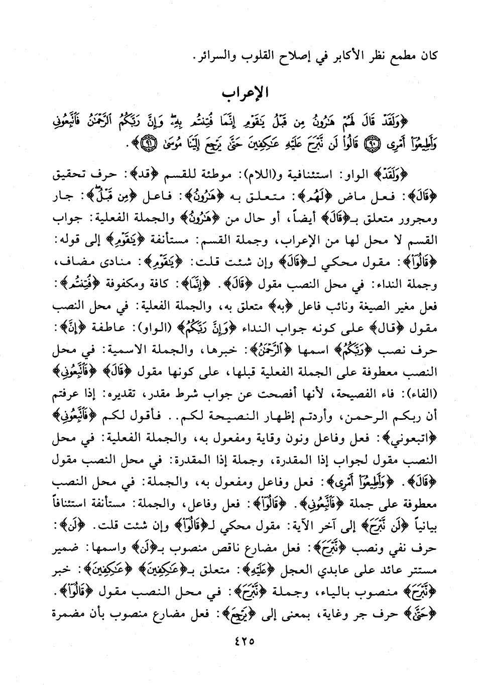 {وَلَقَدْ} الواو: استئنافية و {اللام}:موطئة للقسم {قد}: حرف تحقيق {قَالَ}: فعل ماض {لَهُمْ}: متعلق به {هَارُونُ}: فاعل {مِنْ قَبْلُ}: جار ومجرور متعلق بـ {قَالَ} أيضًا، أو حال من {هَارُونُ} والجملة الفعلية: جواب القسم لا محل لها من الإعراب، وجملة القسم: مستأنفة {يَا قَوْمِ} إلى قوله: {قَالُوا}: مقول محكي لـ {قَالَ} وإن شئت قلت: {يَا قَوْمِ}: منادى مضاف، وجملة النداء: في محل النصب مقول {قَالَ}. {إِنَّمَا}: كافة ومكفوفة {فُتِنْتُمْ}: فعل مغير الصيغة ونائب فاعل {به} متعلق به، والجملة الفعلية: في محل النصب مقول {قال} على كونه جواب النداء {وَإِنَّ رَبَّكُمُ} (الواو): عاطفة {إِنَّ}: حرف نصب {رَبَّكُمُ} اسمها {الرَّحْمَنُ}: خبرها، والجملة الاسمية: في محل النصب معطوفة على الجملة الفعلية قبلها، على كونها مقول {قَالَ} {فَاتَّبِعُونِي} (الفاء): فاء الفصيحة؛ لأنها أفصحت عن جواب شرط مقدر، تقديره: إذا عرفتم أن ربكم الرحمن، وأردتم إظهار النصيحة لكم .. فأقول لكم {فَاتَّبِعُونِي} {اتبعوني}: فعل وفاعل ونون وقاية ومفعول به، والجملة الفعلية: في محل النصب مقول لجواب إذا المقدرة، وجملة إذا المقدرة: في محل النصب مقول {قَالَ}. {وَأَطِيعُوا أَمْرِي}: فعل وفاعل ومفعول به، والجملة: في محل النصب معطوفة على جملة {فَاتَّبِعُونِي}. {قَالُوا}: فعل وفاعل، والجملة: مستأنفة استئنافًا بيانيًا {لَنْ نَبْرَحَ} إلى آخر الآية: مقول محكي لـ {قَالُوا} وإن شئت قلت. {لَنْ}: حرف نفي ونصب {نَبْرَحَ}: فعل مضارع ناقص منصوب بـ {لَنْ} واسمها: ضمير مستتر عائد على عابدي العجل {عَلَيْهِ}: متعلق بـ {عَاكِفِينَ} {عَاكِفِينَ}: خبر {نَبْرَحَ} منصوب بالياء، وجملة {نَبْرَحَ}: في محل النصب مقول {قَالُوا}. {حَتَّى} حرف جر وغاية، بمعنى إلى {يَرْجِعَ}: فعل مضارع منصوب بأن مضمرة