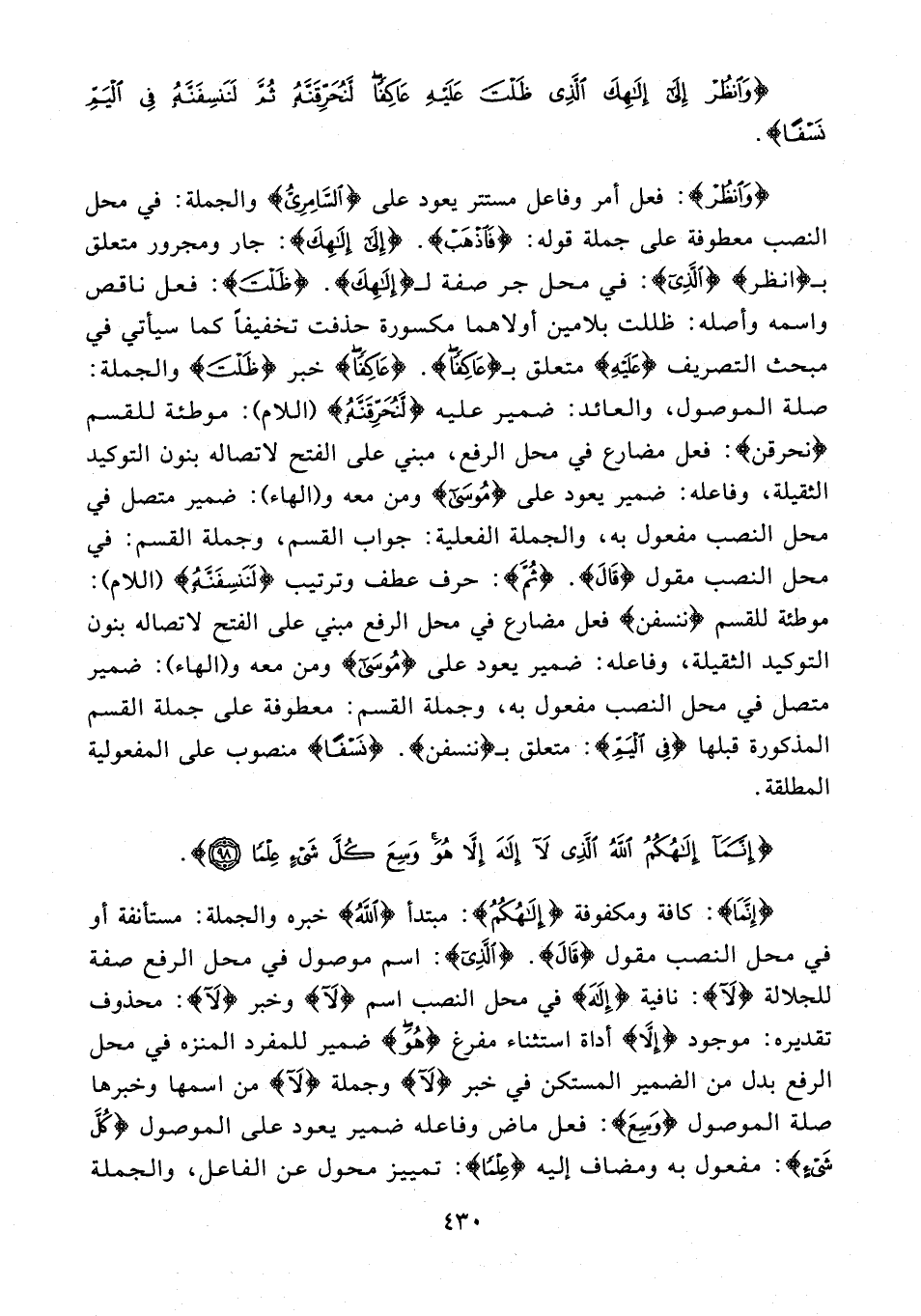 {وَانْظُرْ}: فعل أمر وفاعل مستتر يعود على {السَّامِرِيُّ} والجملة: في محل النصب معطوفة على جملة قوله: {فَاذْهَبْ}. {إِلَى إِلَهِكَ}: جار ومجرور متعلق بـ {انظر} {الَّذِي}: في محل جر صفة لـ {إِلَهِكَ}. {ظَلْتَ}: فعل ناقص واسمه وأصله: ظللت بلامين أولاهما مكسورة حذفت تخفيفًا كما سيأتي في مبحث التصريف {عَلَيْهِ} متعلق بـ {عَاكِفًا}. {عَاكِفًا} خبر {ظَلْتَ} والجملة: صلة الموصول، والعائد: ضمير عليه {لَنُحَرِّقَنَّهُ} (اللام): موطئة للقسم {نحرقن}: فعل مضارع في محل الرفع، مبني على الفتح لاتصاله بنون التوكيد الثقيلة، وفاعله: ضمير يعود على {مُوسَى} ومن معه و (الهاء): ضمير متصل في محل النصب مفعول به، والجملة الفعلية: جواب القسم، وجملة القسم: في محل النصب مقول {قَالَ}. {ثُمَّ}: حرف عطف وترتيب {لَنَنْسِفَنَّهُ} (اللام): موطئة للقسم {ننسفن} فعل مضارع في محل الرفع مبني على الفتح لاتصاله بنون التوكيد الثقيلة، وفاعله: ضمير يعود على {مُوسَى} ومن معه و (الهاء): ضمير متصل في محل النصب مفعول به، وجملة القسم: معطوفة على جملة القسم المذكورة قبلها {فِي الْيَمِّ}: متعلق بـ {ننسفن}. {نَسْفًا} منصوب على المفعولية المطلقة.
