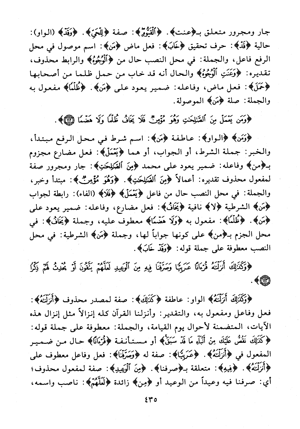 جار ومجرور متعلق بـ {عنت}. {الْقَيُّومِ}: صفة {لِلْحَيِّ}. {وَقَدْ} (الواو): حالية {قَدْ}: حرف تحقيق {خَابَ}: فعل ماض {مَنْ}: اسم موصول في محل الرفع فاعل، والجملة: في محل النصب حال من {الْوُجُوهُ} والرابط محذوف، تقديره: {وَعَنَتِ الْوُجُوهُ} والحال أنه قد خاب من حمل ظلما من أصحابها {حَمَلَ}: فعل ماض، وفاعله: ضمير يعود على {مَنْ}. {ظُلْمًا} مفعول به والجملة: صلة {مَنْ} الموصولة.