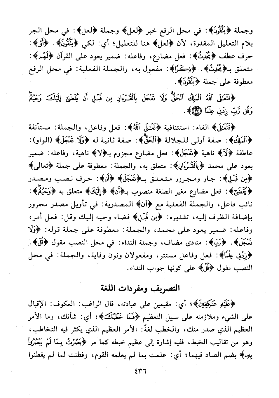 {فَتَعَالَى} الفاء: استئنافية {تَعَالَى اللَّهُ}: فعل وفاعل، والجملة: مستأنفة {الْمَلِكُ}: صفة أولى للجلالة {الْحَقُّ}: صفة ثانية له {وَلَا تَعْجَلْ} (الواو): عاطفة {لَا} ناهية {تَعْجَلْ}: فعل مضارع مجزوم بـ {لا} ناهية، وفاعله: ضمير يعود على محمد {بِالْقُرْآنِ}: متعلق به، والجملة: معطوفة على جملة {تعالى} {مِنْ قَبْلِ}: جار ومجرور متعلق بـ {تَعْجَلْ {أَنْ}: حرف نصب ومصدر {يُقْضَى}: فعل مضارع مغير الصغة منصوب بـ {أَنْ} {إِلَيْكَ} متعلق به {وَحْيُهُ}: نائب فاعل، والجملة الفعلية مع {أن} المصدرية: في تأويل مصدر مجرور بإضافة الظرف إليه، تقديره: {مِنْ قَبْلِ} قضاء وحيه إليك وقيل: فعل أمر، وفاعله: ضمير يعود على محمد، والجملة: معطوفة على جملة قوله: {وَلَا تَعْجَلْ}. {رَبِّ}: منادى مضاف، وجملة النداء: في محل النصب مقول {قُلْ}. {زِدْنِي عِلْمًا}: فعل وفاعل مسشتر، ومفعولان ونون وقاية، والجملة: في محل النصب مقول {قُلْ} على كونها جواب النداء.