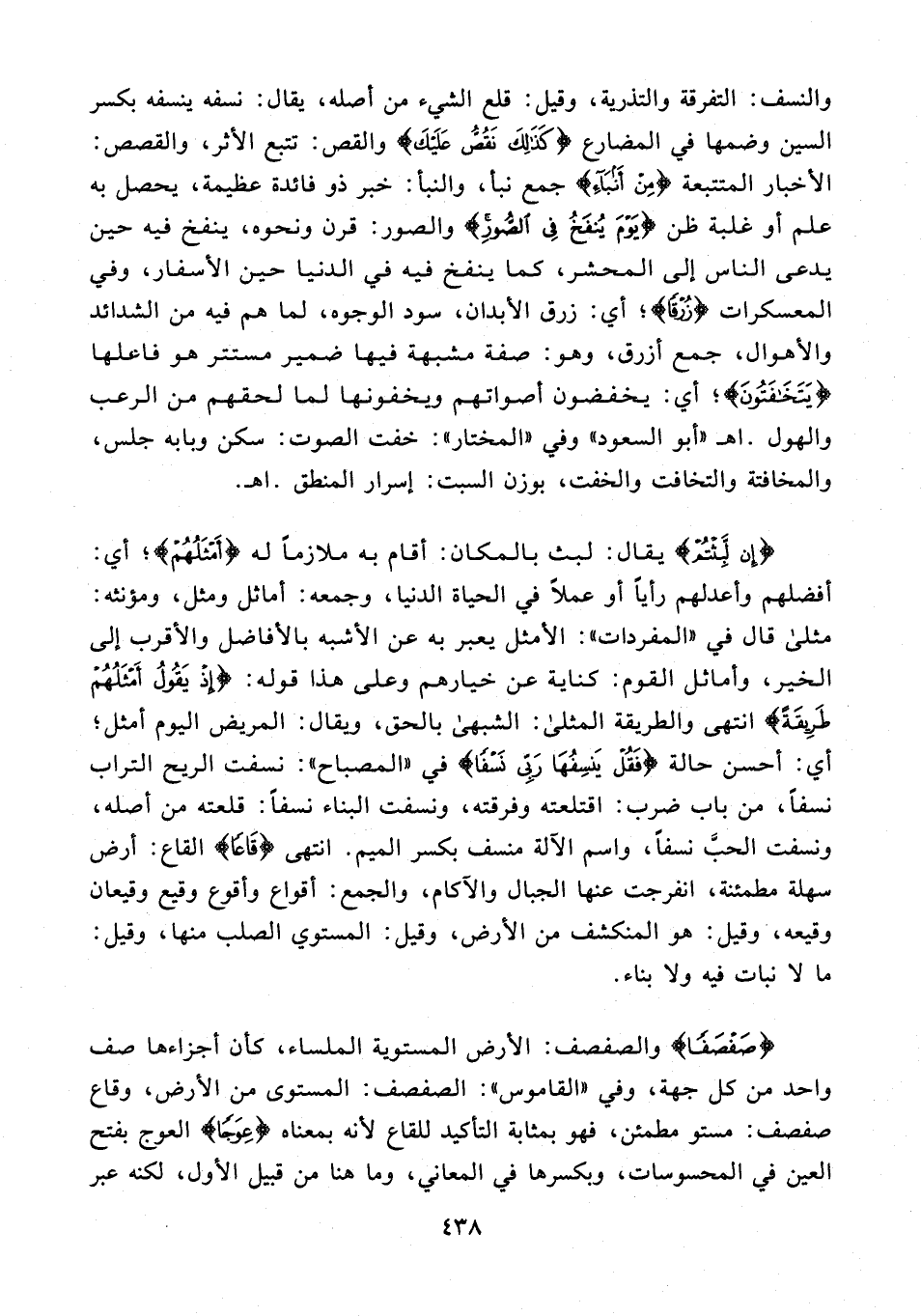 {إِنْ لَبِثْتُمْ} يقال: لبث بالمكان: أقام به ملازمًا له {أَمْثَلُهُمْ}؛ أي: أفضلهم وأعدلهم رأيًا أو عملًا في الحياة الدنيا، وجمعه: أماثل ومثل، ومؤنثه: مثلى قال في "المفردات": الأمثل يعبر به عن الأشبه بالأفاضل والأقرب إلى الخير، وأماثل القوم: كناية عن خيارهم وعلى هذا قوله: {إِذْ يَقُولُ أَمْثَلُهُمْ طَرِيقَةً} انتهى والطريقة المثلى: الشبهى بالحق، ويقال: المريض اليوم أمثل؛ أي: أحسن حالة {فَقُلْ يَنْسِفُهَا رَبِّي نَسْفًا} في "المصباح": نسفت الريح التراب نسفًا، من باب ضرب: اقتلعته وفرقته، ونسفت البناء نسفًا: قلعته من أصله، ونسفت الحبَّ نسفًا، واسم الآلة منسف بكسر الميم. انتهى {قَاعًا} القاع: أرض سهلة مطمئنة، انفرجت عنها الجبال والآكام، والجمع: أقواع وأقوع وقيع وقيعان وقيعه، وقيل: هو المنكشف من الأرض، وقيل: المستوي الصلب منها، وقيل: ما لا نبات فيه ولا بناء.