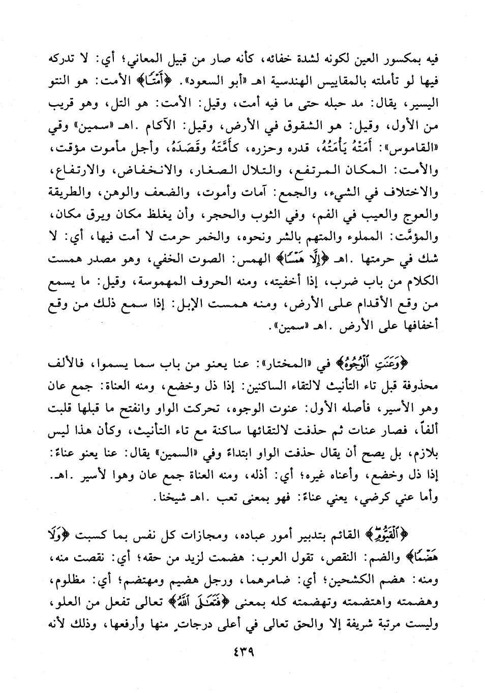 فيه بمكسور العين لكونه لشدة خفائه، كأنه صار من قبيل المعاني؛ أي: لا تدركه فيها لو تأملته بالمقاييس الهندسية اهـ "أبو السعود". {أَمْتًا} الأمت: هو النتو اليسير، يقال: مد حبله حتى ما فيه أمت، وقيل: الأمت: هو التل، وهو قريب من الأول، وقيل: هو الشقوق في الأرض، وقيل: الآكام. اهـ "سمين" وفي "القاموس": أَمَتْهُ يَأْمَتُهُ، قدره وحزره، كأَمَّتَهُ وقَصَدَهُ، وأجل مأموت مؤقت، والأمت: المكان المرتفع، والتلال الصغار، والانخفاض، والارتفاع، والاختلاف في الشيء، والجمع: آمات وأموت، والضعف والوهن، والطريقة والعوج والعيب في الفم، وفي الثوب والحجر، وأن يغلظ مكان ويرق مكان، والمؤمَّت: المملوء والمتهم بالشر ونحوه، والخمر حرمت لا أمت فيها، أي: لا شك في حرمتها. اهـ {إِلَّا هَمْسًا} الهمس: الصوت الخفي، وهو مصدر همست الكلام من باب ضرب، إذا أخفيته، ومنه الحروف المهموسة، وقيل: ما يسمع من وقع الأقدام على الأرض، ومنه همست الإبل: إذا سمع ذلك من وقع أخفافها على الأرض. اهـ "سمين".