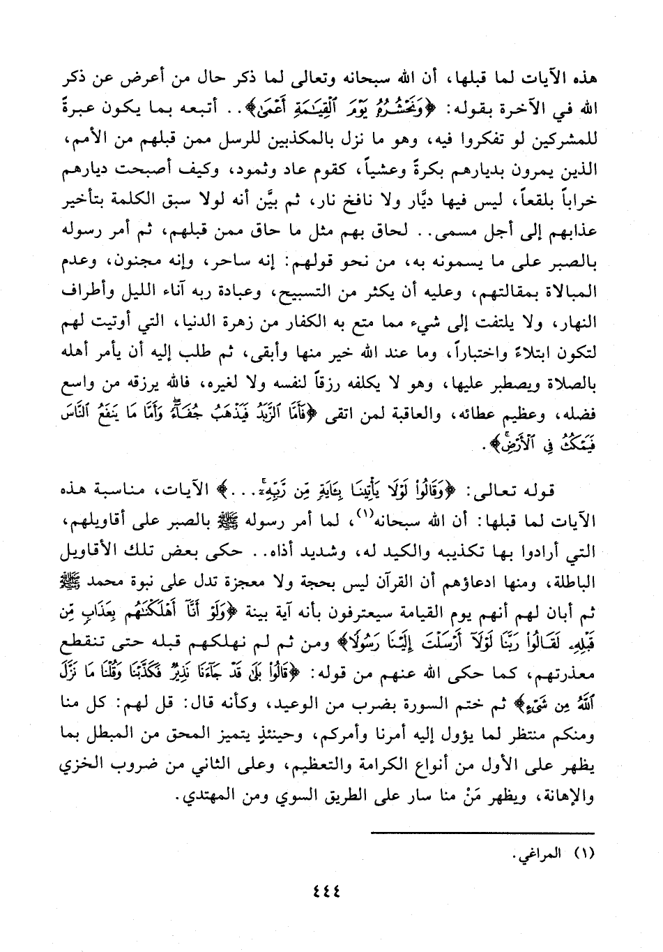 هذه الآيات لما قبلها، أن الله سبحانه وتعالى لما ذكر حال من أعرض عن ذكر الله في الآخرة بقوله: {وَنَحْشُرُهُ يَوْمَ الْقِيَامَةِ أَعْمَى ...} أتبعه بما يكون عبرةً للمشركين لو تفكروا فيه، وهو ما نزل بالمكذبين للرسل ممن قبلهم من الأمم، الذين يمرون بديارهم بكرةً وعشيًا، كقوم عاد وثمود، وكيف أصبحت ديارهم خرابًا بلقعًا، ليس فيها ديَّار ولا نافخ نار، ثم بيَّن أنه لولا سبق الكلمة بتأخير عذابهم إلى أجل مسمى .. لحاق بهم مثل ما حاق ممن قبلهم، ثم أمر رسوله بالصبر على ما يسمونه به، من نحو قولهم: إنه ساحر، وإنه مجنون، وعدم المبالاة بمقالتهم، وعليه أن يكثر من التسبيح، وعبادة ربه آناء الليل وأطراف النهار، ولا يلتفت إلى شيء مما متع به الكفار من زهرة الدنيا، التي أوتيت لهم لتكون ابتلاءً واختبارًا، وما عند الله خير منها وأبقى، ثم طلب إليه أن يأمر أهله بالصلاة ويصطبر عليها، وهو لا يكلفه رزقًا لنفسه ولا لغيره، فالله يرزقه من واسح فضله، وعظيبم عطائه، والعاقبة لمن اتقى {فَأَمَّا الزَّبَدُ فَيَذْهَبُ جُفَاءً وَأَمَّا مَا يَنْفَعُ النَّاسَ فَيَمْكُثُ فِي الْأَرْضِ}.