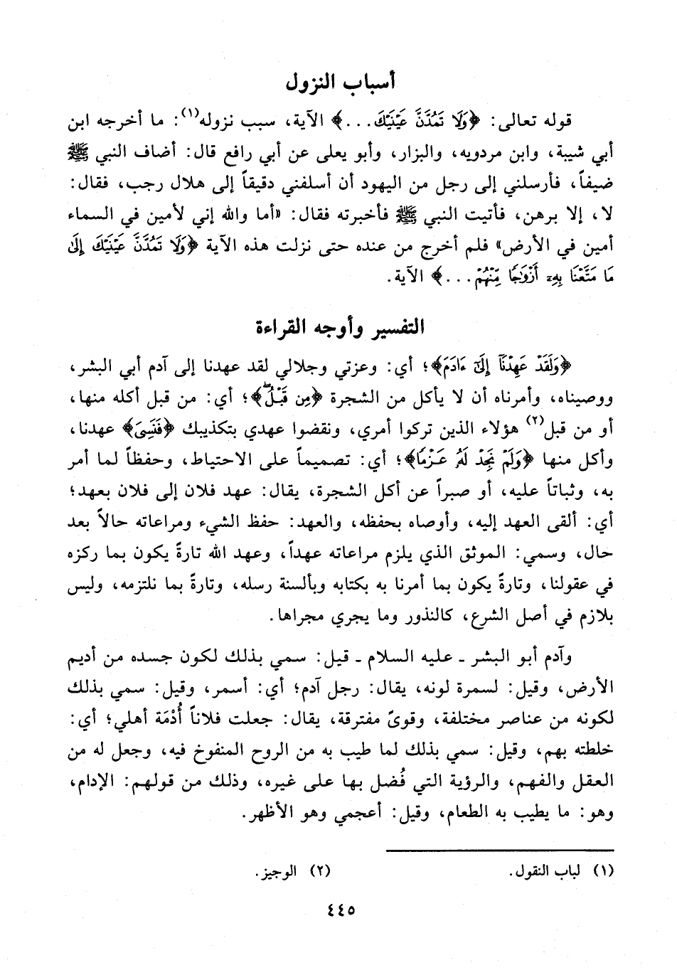115 - {وَلَقَدْ عَهِدْنَا إِلَى آدَمَ}؛ أي: وعزتي وجلالي لقد عهدنا إلى آدم أبي البشر، ووصيناه، وأمرناه أن لا يأكل من الشجرة {مِنْ قَبْلُ}؛ أي: من قبل أكله منها، أو من قبل (¬2) هؤلاء الذين تركوا أمري، ونقضوا عهدي بتكذيبك {فَنَسِيَ} عهدنا، وأكل منها {وَلَمْ نَجِدْ لَهُ عَزْمًا}؛ أي: تصميمًا على الاحتياط، وحفظًا لما أمر به، وثباتًا عليه، أو صبرًا عن أكل الشجرة، يقال: عهد فلان إلى فلان بعهد؛ أي: ألقى العهد إليه، وأوصاه بحفظه، والعهد: حفظ الشيء ومراعاته حالًا بعد حال، وسمي: الموثق الذي يلزم مراعاته عهدًا، وعهد الله تارةً يكون بما ركزه في عقولنا، وتارةً يكون بما أمرنا به بكتابه وبألسنة رسله، وتارةً بما نلتزمه، وليس بلازم في أصل الشرع، كالنذور وما يجري مجراها.