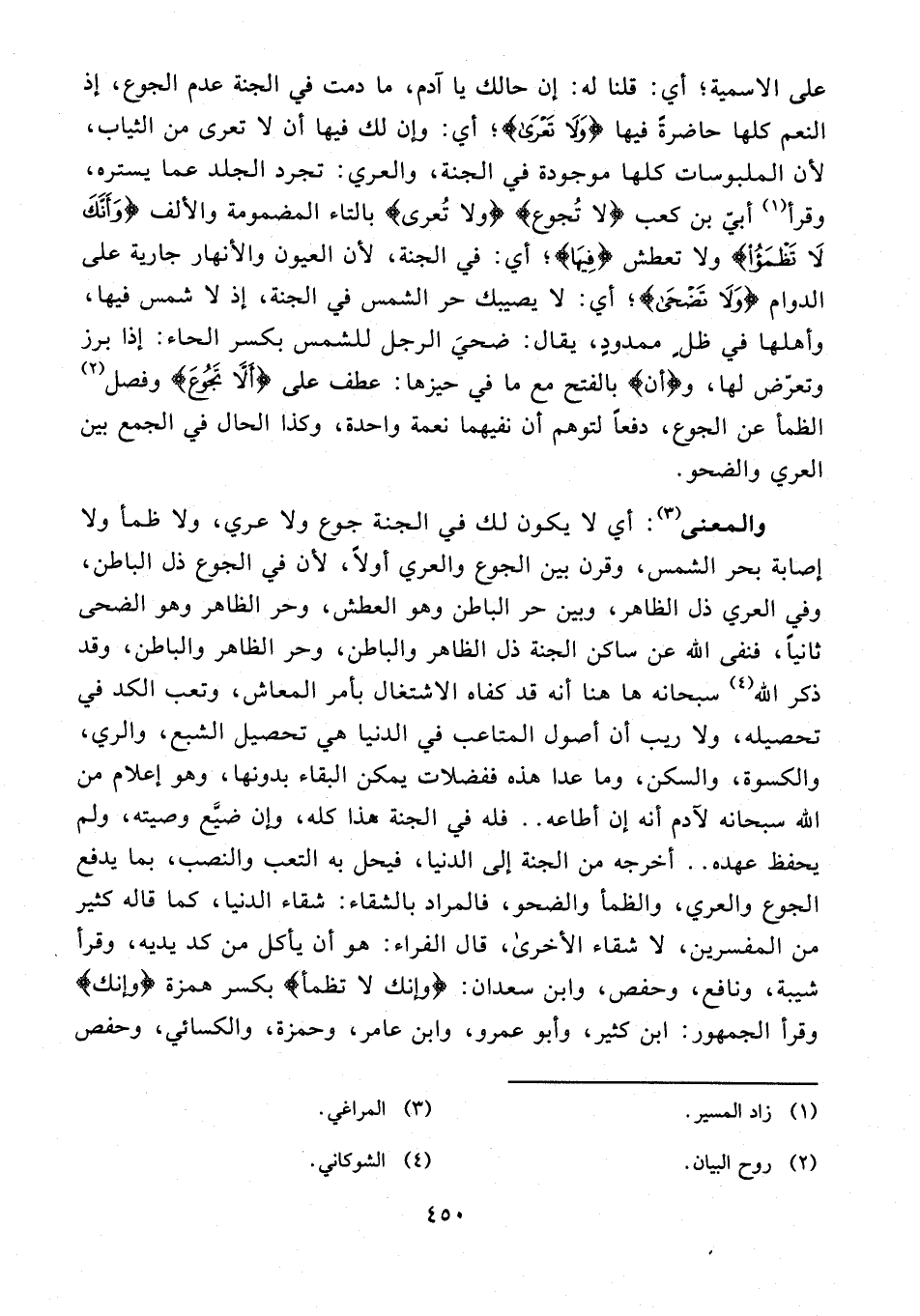 على الاسمية؛ أي: قلنا له: إن حالك يا آدم، ما دمت في الجنة عدم الجوع، إذ النعم كلها حاضرةً فيها {وَلَا تَعْرَى}؛ أي: وإن لك فيها أن لا تعرى من الثياب، لأن الملبوسات كلها موجودة في الجنة، والعري: تجرد الجلد عما يستره، وقرأ (¬1) أبيّ بن كعب {لا تُجوع} {ولا تُعرى} بالتاء المضمومة والألف