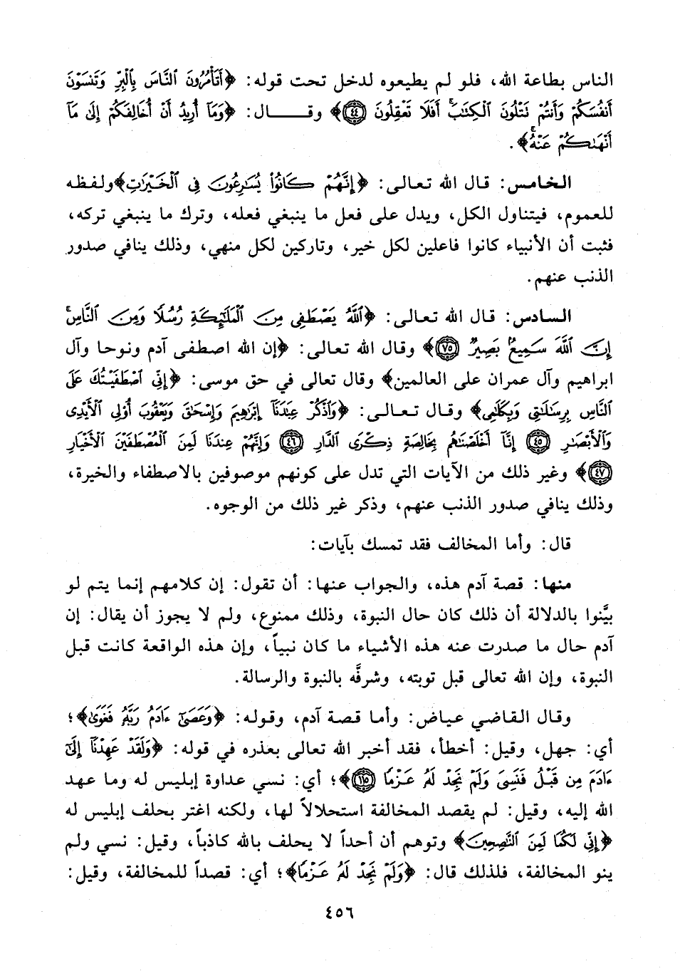 السادس: قال الله تعالى: {اللَّهُ يَصْطَفِي مِنَ الْمَلَائِكَةِ رُسُلًا وَمِنَ النَّاسِ إِنَّ اللَّهَ سَمِيعٌ بَصِيرٌ} وقال الله تعالى: {إِنَّ اللَّهَ اصْطَفَى آدَمَ وَنُوحًا وَآلَ إِبْرَاهِيمَ وَآلَ عِمْرَانَ عَلَى الْعَالَمِينَ} وقال تعالى في حق موسى: {إِنِّي اصْطَفَيْتُكَ عَلَى النَّاسِ بِرِسَالَاتِي وَبِكَلَامِي} وقال تعالى: {وَاذْكُرْ عِبَادَنَا إِبْرَاهِيمَ وَإِسْحَاقَ وَيَعْقُوبَ أُولِي الْأَيْدِي وَالْأَبْصَارِ (45) إِنَّا أَخْلَصْنَاهُمْ بِخَالِصَةٍ ذِكْرَى الدَّارِ (46) وَإِنَّهُمْ عِنْدَنَا لَمِنَ الْمُصْطَفَيْنَ الْأَخْيَارِ (47)} وغير ذلك من الآيات التي تدل على كونهم موصوفين بالاصطفاء والخيرة، وذلك ينافي صدور الذنب عنهم، وذكر غير ذلك من الوجوه.