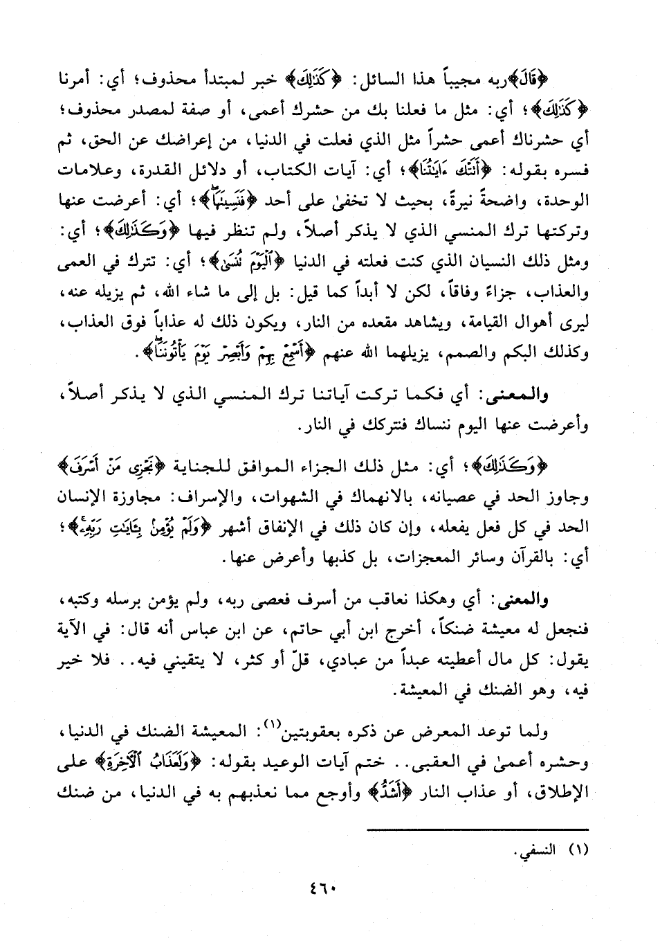126 - {قَالَ} ربه مجيبًا هذا السائل: {كَذَلِكَ} خبر لمبتدأ محذوف؛ أي: أمرنا {كَذَلِكَ}؛ أي: مثل ما فعلنا بك من حشرك أعمى، أو صفة لمصدر محذوف؛ أي حشرناك أعمى حشراً مثل الذي فعلت في الدنيا، من إعراضك عن الحق، ثم فسره بقوله: {أَتَتْكَ آيَاتُنَا}؛ أي: آيات الكتاب، أو دلائل القدرة، وعلامات الوحدة، واضحةً نيرةً، بحيث لا تخفى على أحد {فَنَسِيتَهَا}؛ أي: أعرضت عنها وتركتها ترك المنسي الذي لا يذكر أصلًا، ولم تنظر فيها {وَكَذَلِكَ}؛ أي: ومثل ذلك النسيان الذي كنت فعلته في الدنيا {الْيَوْمَ تُنْسَى}؛ أي: تترك في العمى والعذاب، جزاءً وفاقًا، لكن لا أبدًا كما قيل: بل إلى ما شاء الله، ثم يزيله عنه، ليرى أهوال القيامة، ويشاهد مقعده من النار، ويكون ذلك له عذابًا فوق العذاب، وكذلك البكم والصم، يزيلهما الله عنهم {أَسْمِعْ بِهِمْ وَأَبْصِرْ يَوْمَ يَأْتُونَنَا}.