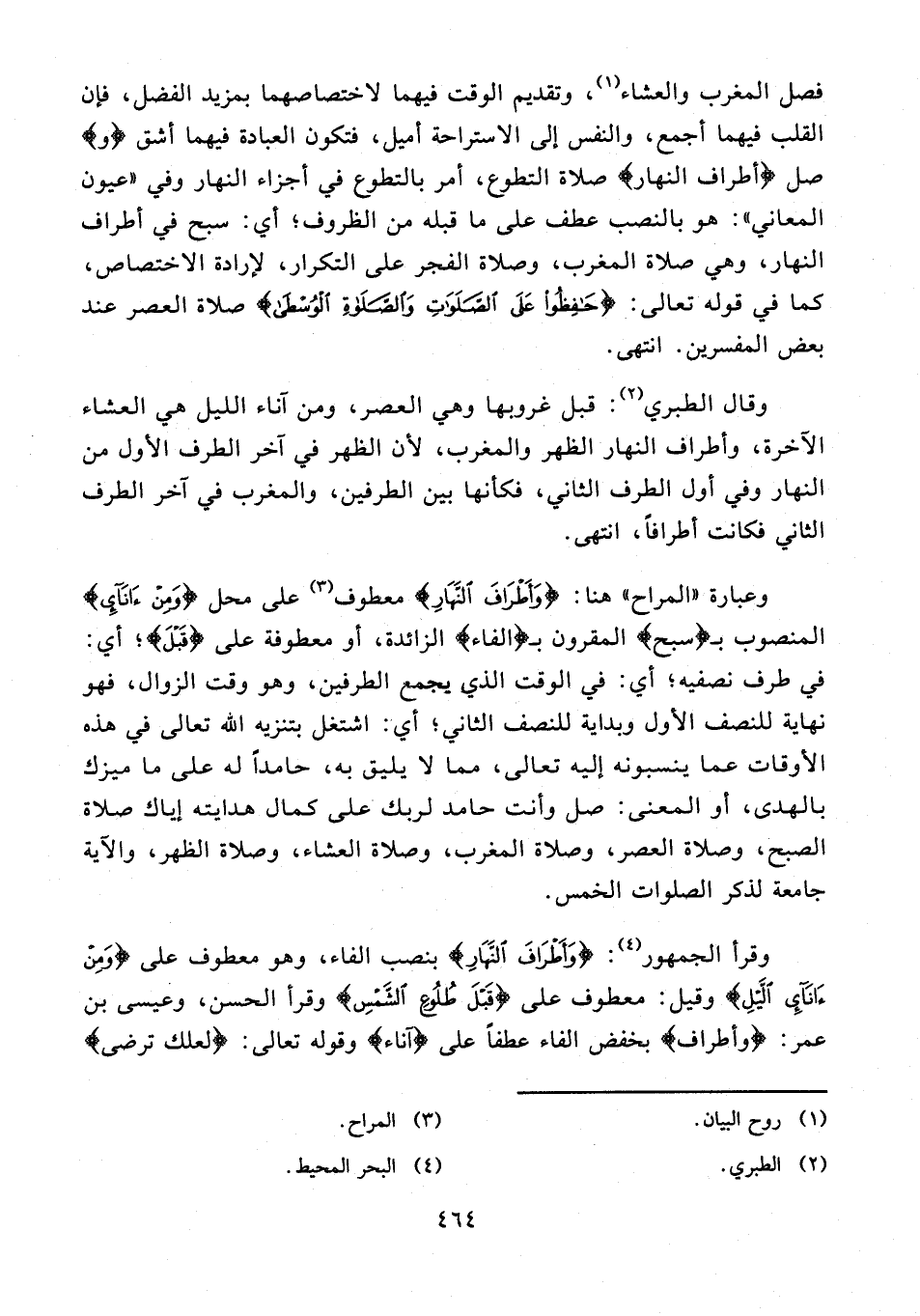 وقال الطبري (¬2): قبل غروبها وهي العصر، ومن آناء الليل هي العشاء الآخرة، وأطراف النهار الظهر والمغرب؛ لأن الظهر في آخر الطرف الأول من النهار وفي أول الطرف الثاني، فكأنها بين الطرفين، والمغرب في آخر الطرف الثاني فكانت أطرافاً، انتهى.