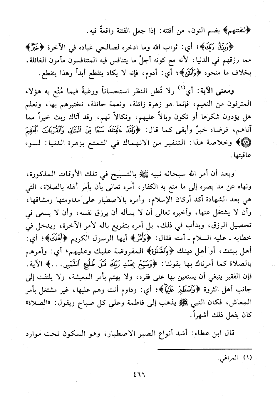 ومعنى الآية: أي (¬1) ولا تُطل النظر استحسانًا ورغبةً فيما مُتع به هؤلاء المترفون من النعيم، فإنما هو زهرة زائلة، ونعمة حائلة، نختبرهم بها، ونعلم هل يؤدون شكرها أو تكون وبالًا عليهم، ونكالًا لهم، وقد آتاك ربك خيرًا مما آتاهم، فرضاه خيرٌ وأبقى كما قال: {وَلَقَدْ آتَيْنَاكَ سَبْعًا مِنَ الْمَثَانِي وَالْقُرْآنَ الْعَظِيمَ (87)} وخلاصة هذا: التنفير من الانهماك في التمتع بزهرة الدنيا: لسوء عاقبتها.