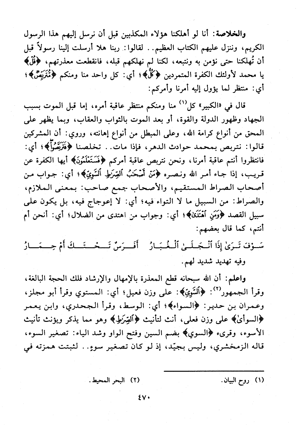 واعلم: أن الله سبحانه قطع المعذرة بالإمهال والإرشاد ذلك الحجة البالغة، وقرأ الجمهور (¬2): {السَّوِيِّ}: على وزن فعيل؛ أي: المستوي وقرأ أبو مجلز، وعمران بن حدير: {السواء}؛ أي: الوسط، وقرأ الجحدري، وابن يعمر {السوأى} على وزن فعلى، أنث لتأنيث {الصِّرَاطِ} وهو مما يذكر ويؤنث تأنيث الأسوء، وقرىء {السوي} بضم السين وفتح الواو وشد الياء: تصغير السوء، قاله الزمخشري، وليس بجيّد، إذ لو كان تصغير سوءٍ .. لثبتت همزته في