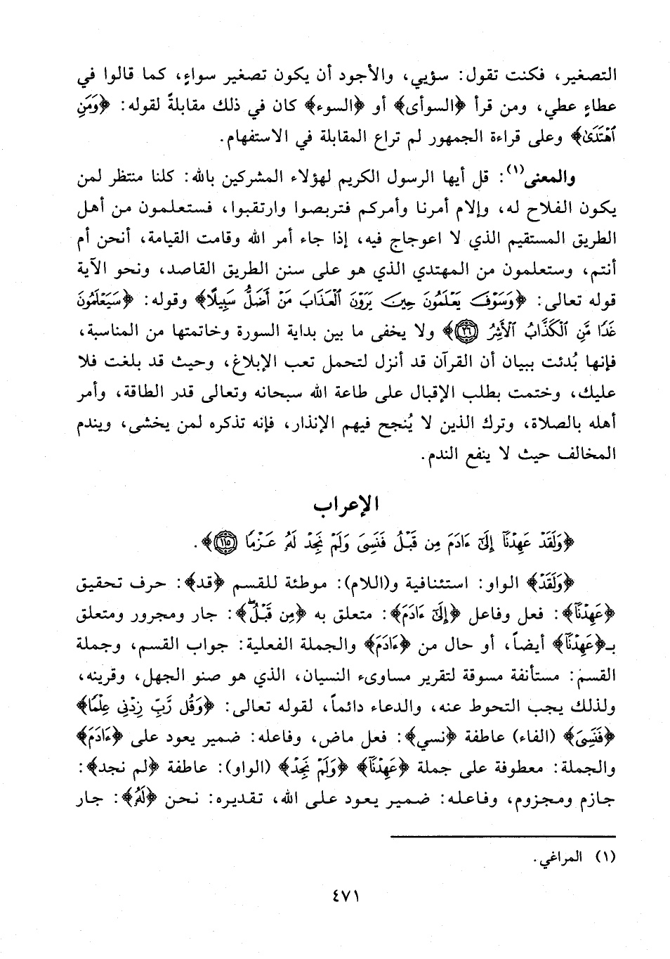{وَلَقَدْ} الواو: استئنافية و (اللام): موطئة للقسم {قد}: حرف تحقيق {عَهِدْنَا}: فعل وفاعل {إِلَى آدَمَ}: متعلق به {مِنْ قَبْلُ}: جار ومجرور ومتعلق بـ {عَهِدْنَا} أيضًا، أو حال من {آدَمَ} والجملة الفعلية: جواب القسم، وجملة القسم: مستأنفة مسوقة لتقرير مساوىء النسيان، الذي هو صنو الجهل، وقرينه، ولذلك يجب التحوط عنه، والدعاء دائمًا، لقوله تعالى: {وَقُلْ رَبِّ زِدْنِي عِلْمًا} {فَنَسِيَ} (الفاء) عاطفة {نسي}: فعل ماض، وفاعله: ضمير يعود على {آدَمَ} والجملة: معطوفة على جملة {عَهِدْنَا} {وَلَمْ نَجِدْ} (الواو): عاطفة {لم نجد}: جازم ومجزوم، وفاعله: ضمير يعود على الله، تقديره: نحن {لَهُ}: جار