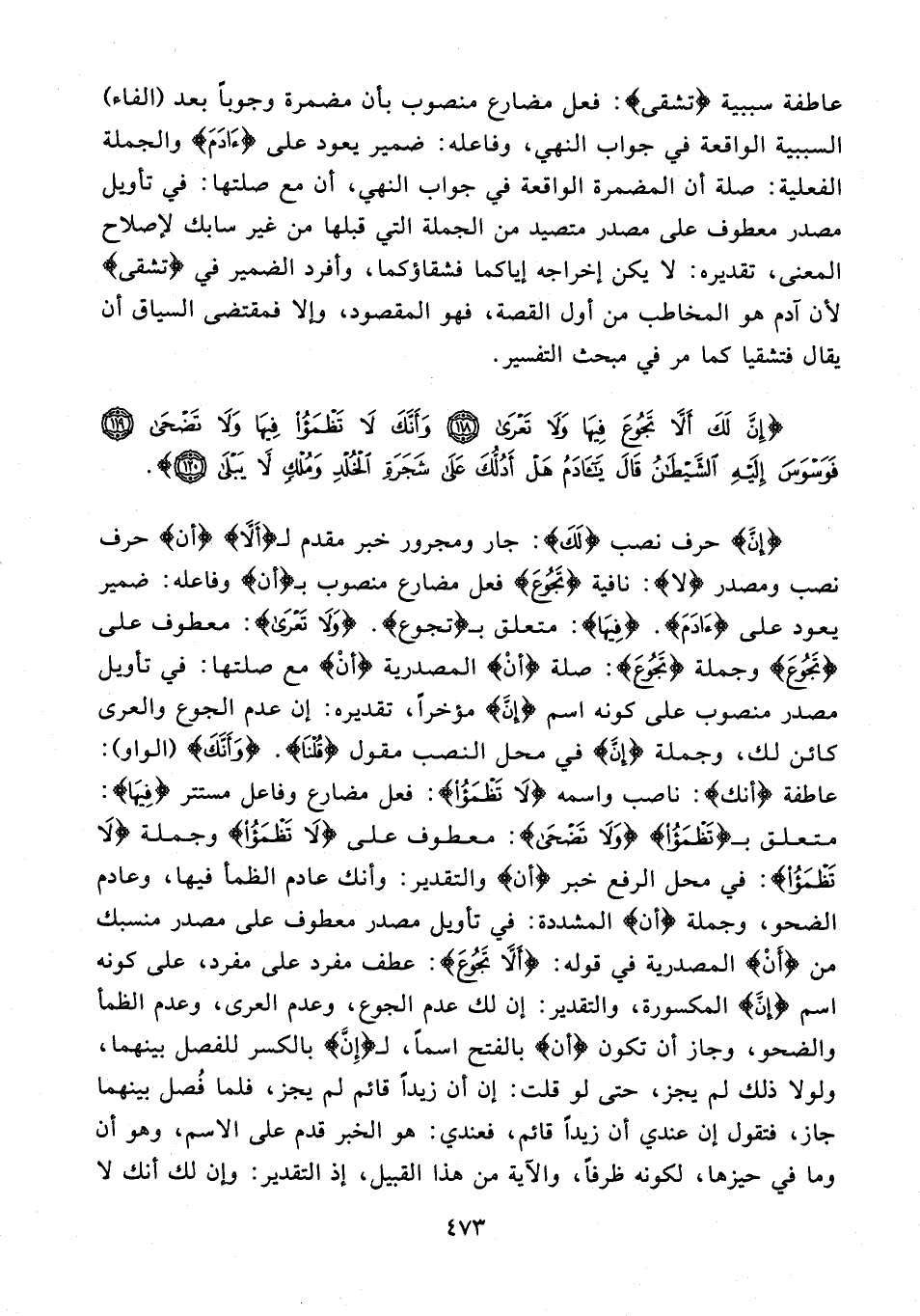 {إِنَّ} حرف نصب {لَكَ}: جار ومجرور خبر مقدم لـ {أَلَّا} {أن} حرف نصب ومصدر {لا}: نافية {تَجُوعَ} فعل مضارع منصوب بـ {أن} وفاعله: ضمير يعود على {آدَمُ}. {فِيهَا}: متعلق بـ {تجوع}. {وَلَا تَعْرَى}: معطوف على {تَجُوعَ} وجملة {تَجُوعَ}: صلة {أنْ} المصدرية {أنْ} مع صلتها: في تأويل مصدر منصوب على كونه اسم {إِنَّ} مؤخرًا، تقديره: إن عدم الجوع والعرى كائن لك، وجملة {إِنَّ} في محل النصب مقول {قُلْنَا}. {وَأَنَّكَ} (الواو): عاطفة {أنك}: ناصب واسمه {لَا تَظْمَأُ}: فعل مضارع وفاعل مستتر {فِيهَا}: متعلق بـ {تَظْمَأُ} {وَلَا تَضْحَى}: معطوف على {لَا تَظْمَأُ} وجملة {لَا تَظْمَأُ}: في محل الرفع خبر {أن} والتقدير: وأنك عادم الظمأ فيها، وعادم الضحو، وجملة {أن} المشددة: في تأويل مصدر معطوف على مصدر منسبك من {أنْ} المصدرية في قوله: {أَلَّا تَجُوعَ}: عطف مفرد على مفرد، على كونه اسم {إِنَّ} المكسورة، والتقدير: إن لك عدم الجوع، وعدم العربي، وعدم الظمأ والضحو، وجاز أن تكون {إِن} بالفتح اسمًا، لـ {إِنَّ} بالكسر للفصل بينهما، ولولا ذلك لم يجز، حتى لو قلت: إن أن زيدًا قائم لم يجز، فلما فُصل بينهما جاز، فتقول إن عندي أن زيدًا قائم، فعندي: هو الخبر قدم على الاسم، وهو أن وما في حيزها ,لكونه ظرفًا، والآية من هذا القبيل، إذ التقدير: وإن لك أنك لا