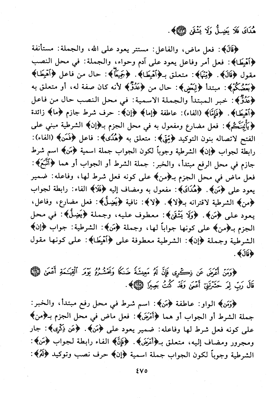 {قَالَ}: فعل ماض، والفاعل: مستتر يعود على الله، والجملة: مستأنفة {اهْبِطَا}: فعل أمر وفاعل يعود على آدم وحواء، والجملة: في محل النصب مقول {قَالَ}. {مِنْهَا}: متعلق بـ {اهْبِطَا}. {جَمِيعًا}: حال من فاعل {اهْبِطَا} {بَعْضُكُمْ}: مبتدأ {لِبَعْضٍ}: حال من {عَدُوٌّ} لأنه كان صفة له، أو متعلق به {عَدُوٌّ}: خبر المبتدأ والجملة الاسمية: في محل النصب حال من فاعل {اهْبِطَا}. {فَإِمَّا} (الفاء): عاطفة {إما} {إن}: حرف شرط جازم {ما} زائدة {يَأْتِيَنَّكُمْ}: فعل مضارع ومفعول به في محل الجزم بـ {إن} الشرطية مبني على الفتح لاتصاله بنون التوكيد {مِنِّي}: متعلق به {هُدًى}: فاعل {فَمَن} (الفاء): رابطة لجواب {إن} الشرطية وجوبًا لكون الجواب جملة اسمية {مَنْ} اسم شرط جازم في محل الرفع مبتدأ، والخبر: جملة الشرط أو الجواب أو هما {اتَّبَعَ}: فعل ماض في محل الجزم بـ {من} على كونه فعل شرط لها، وفاعله: ضمير يعود على {مِنْ}. {هَدَى}: مفعول به ومضاف إليه {فَلَا} الفاء: رابطة لجواب {من} الشرطية لاقترانه بـ {لا}. {لا}: نافية {يَضِلُّ}: فعل مضارع، وفاعل، يعود على {مَن}. {وَلَا يَشْقَى}: معطوف عليه، وجملة {يَضِلُّ}: في محل الجزم بـ {من} على كونها جوابًا لها، وجملة {مَن}: الشرطية: جواب {إن} الشرطية وجملة {إن}: الشرطية معطوفة على {اهْبِطَا}: على كونها مقول {قَالَ}.